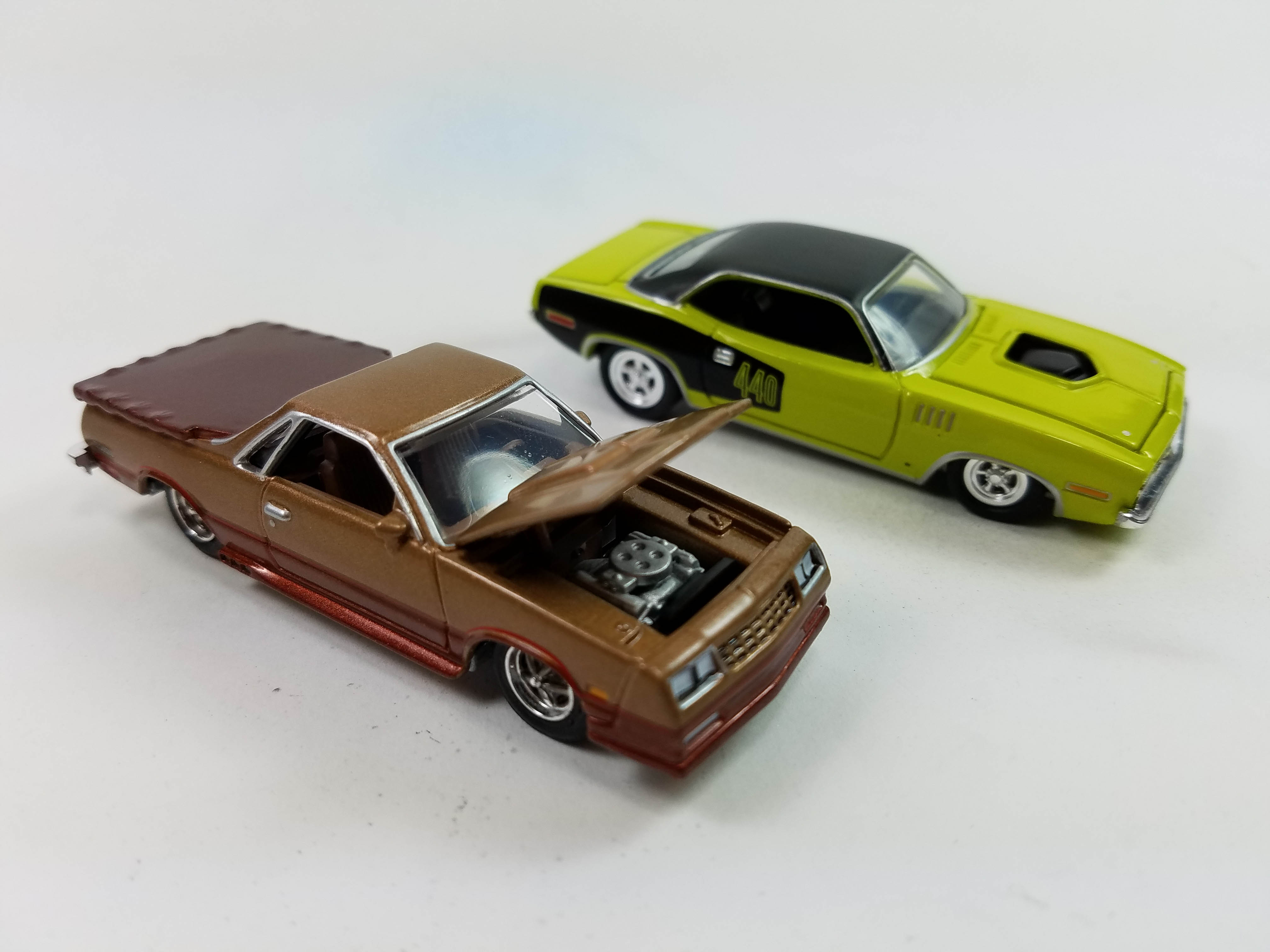 Equally cool is the metallic sandstone brown 1986 Chevy El Camino with contrasting copper lower body stripes and tonneau cover. Again, the detail is what will sell you on these 1/64 scale vehicles. Window trim and door handles are painted silver and there’s even a slender B-pillar window behind the massive doors. A chrome bumper in back and painted one in front to match the side cladding gives this a real 1980s look. Again, the hood opens to reveal a silver engine block.
