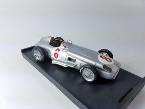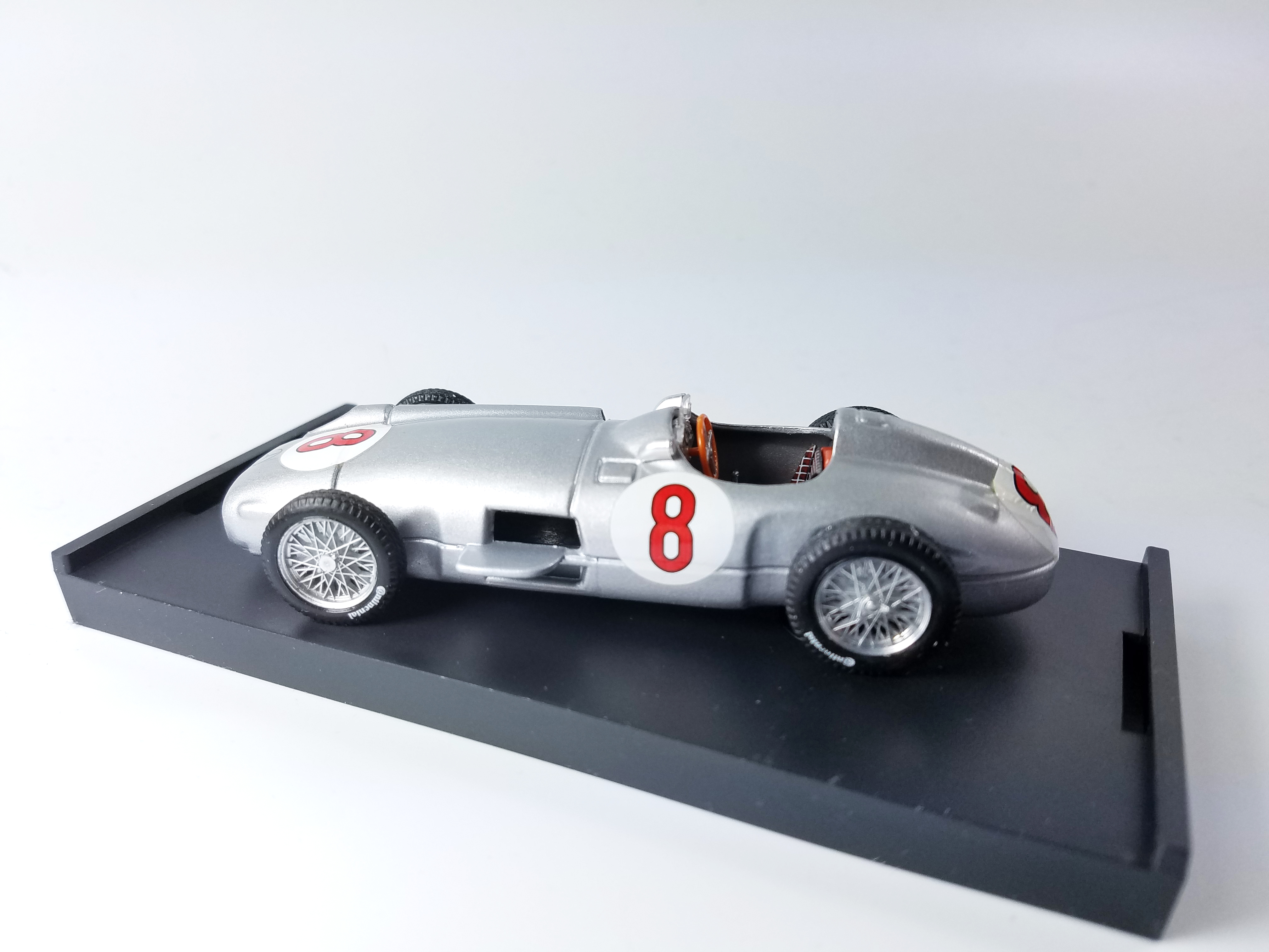 The silver Mercedes W-196 is a replica of the No. 8 that Fangio drove to a win in the 1955 Grand Prix of Olanda at Zandvoort, the Netherlands, on his way to the F1 Championship that year.