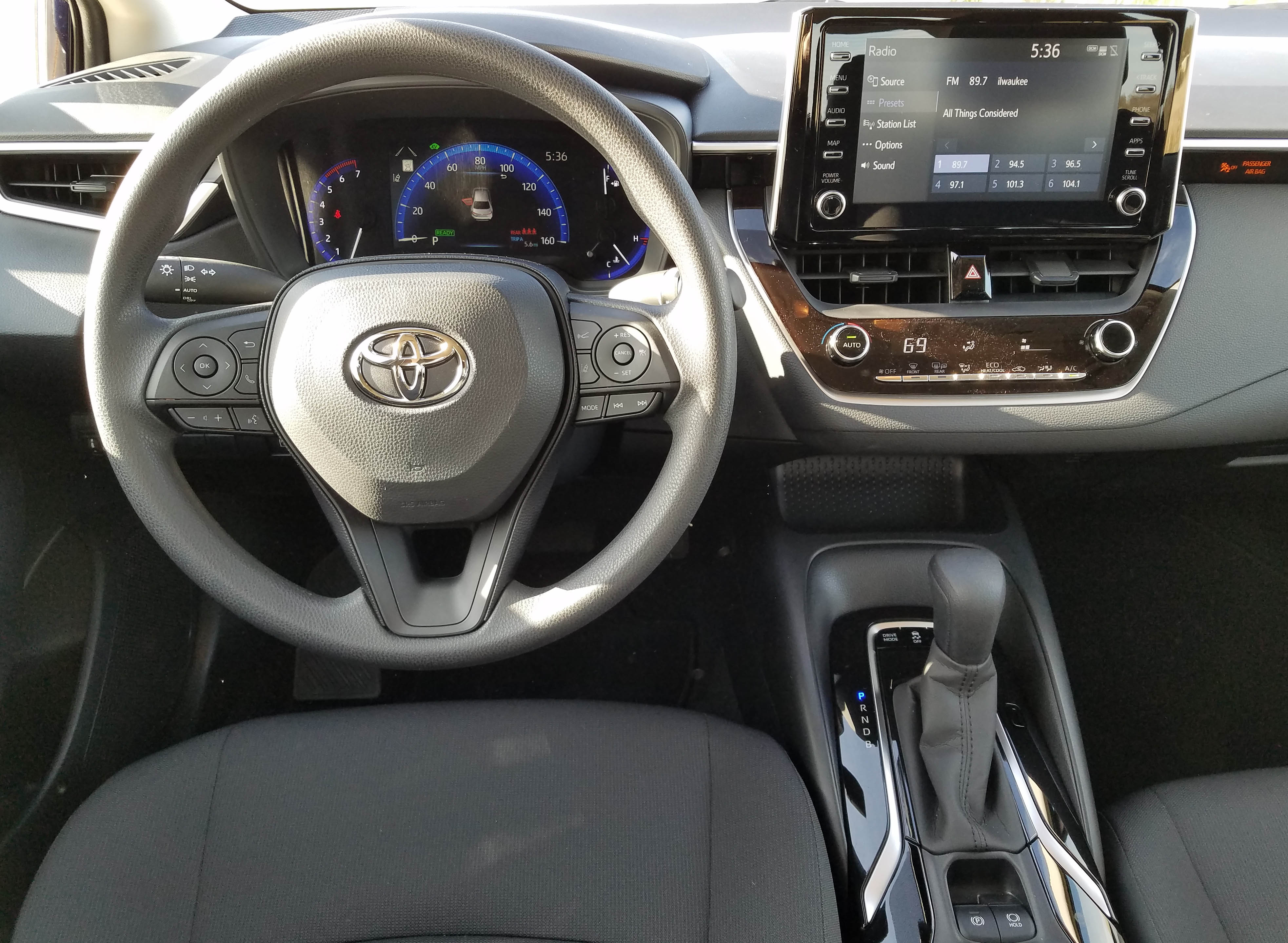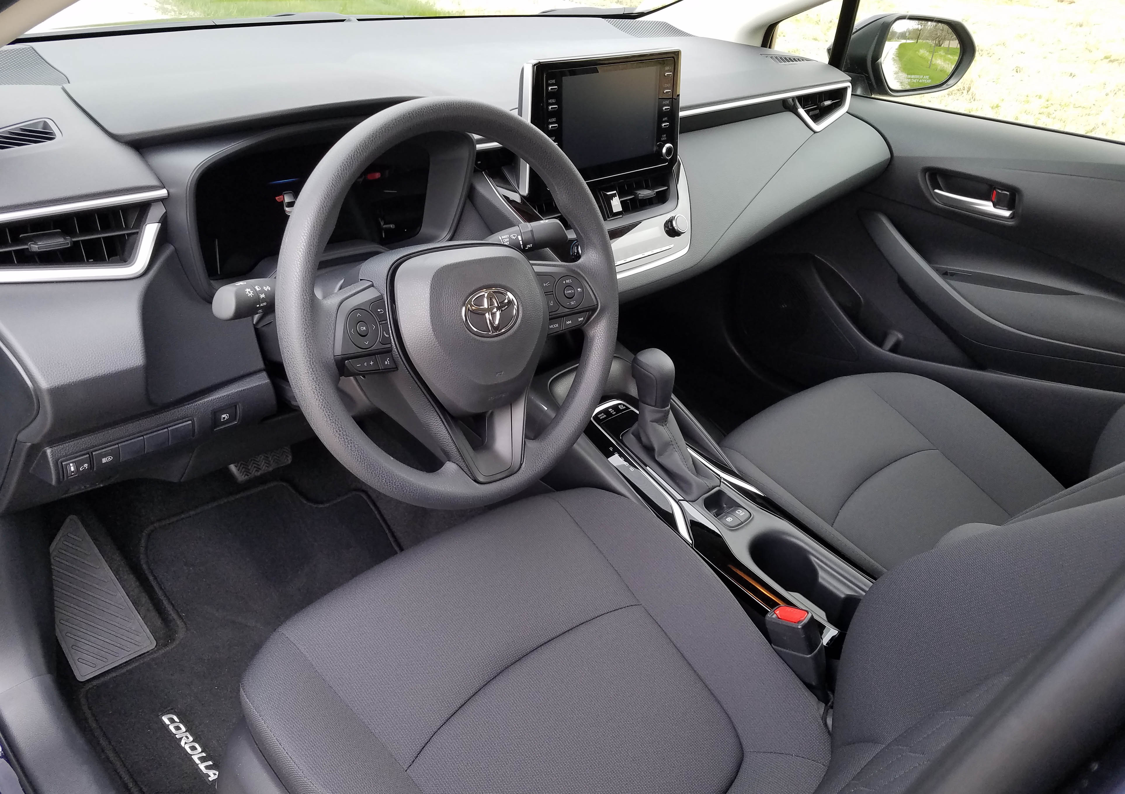 The interior also is simple and the dash well laid out, but this is where you realize the Corolla is an entry-level sedan. Dash and door trim remains a hard plastic and the steering wheel also is a textured plastic compound. All functional and easy to clean, but not much pizazz here.