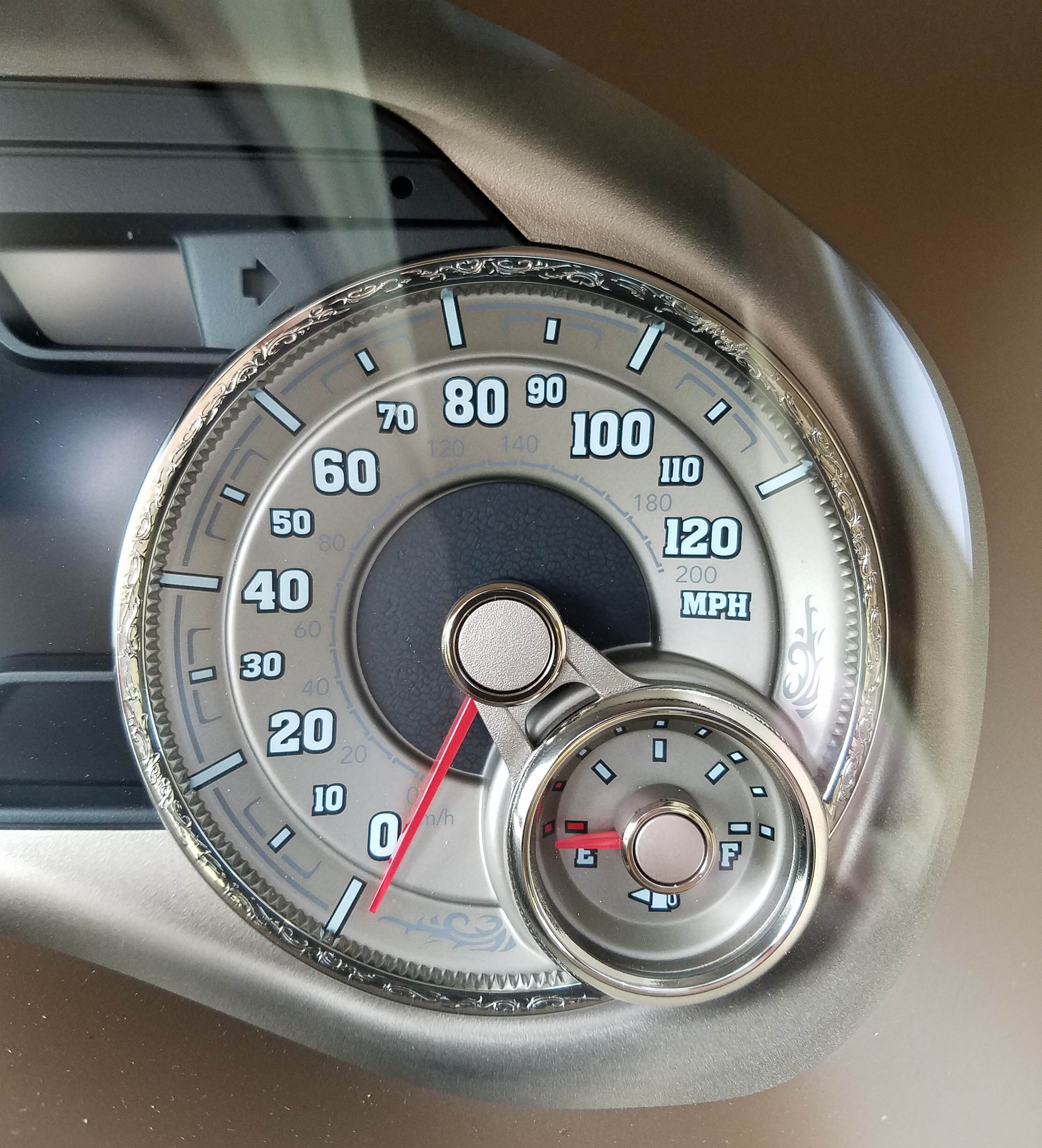 And then there’s the driver’s instrument panel with all the gauges trimmed in carved chrome surrounds that remind of fancy scrolling and designs on a cowboy’s dress-up belt. Only the big turquoise stone is missing. Even the floor mats have fancy chrome Laramie badges.