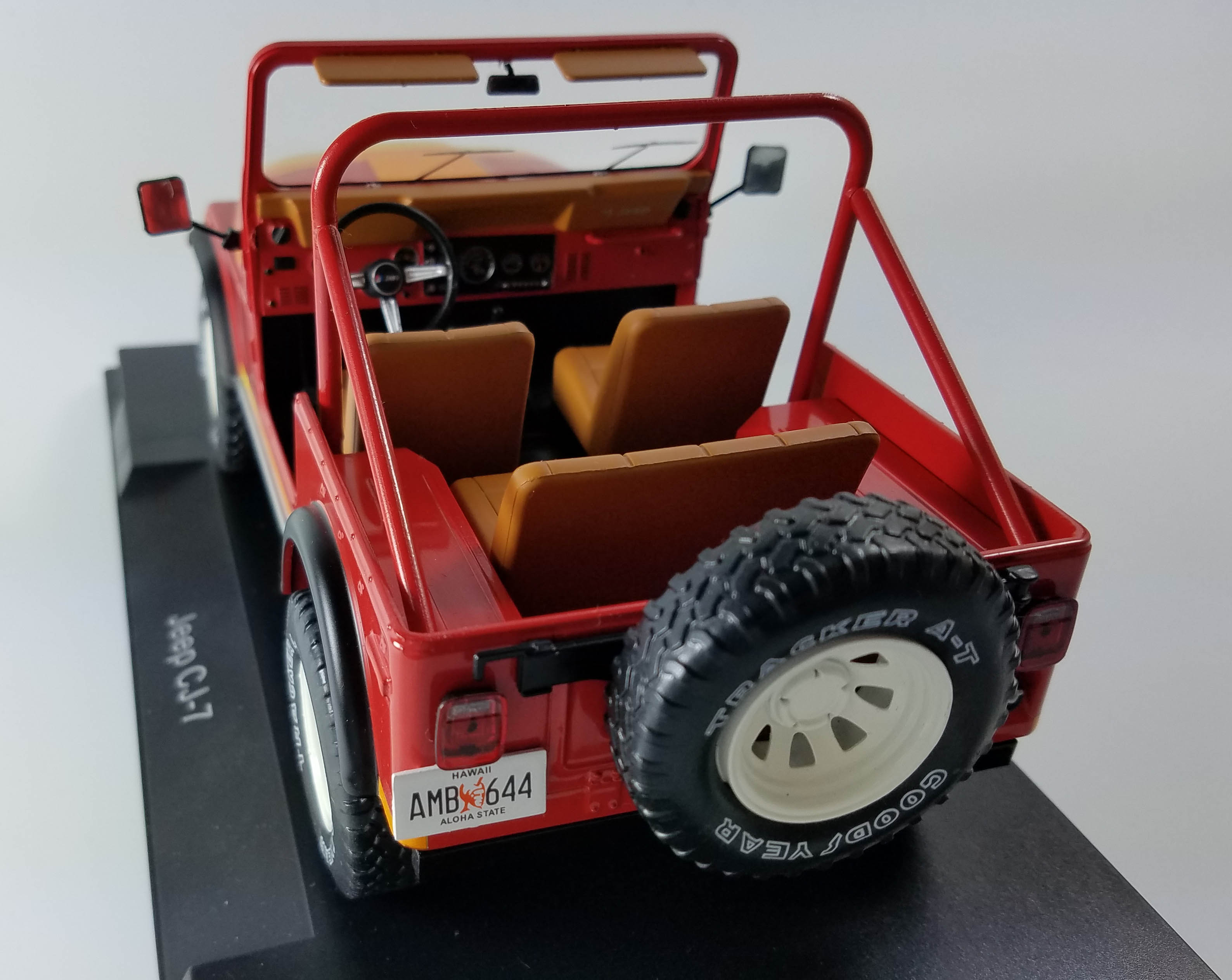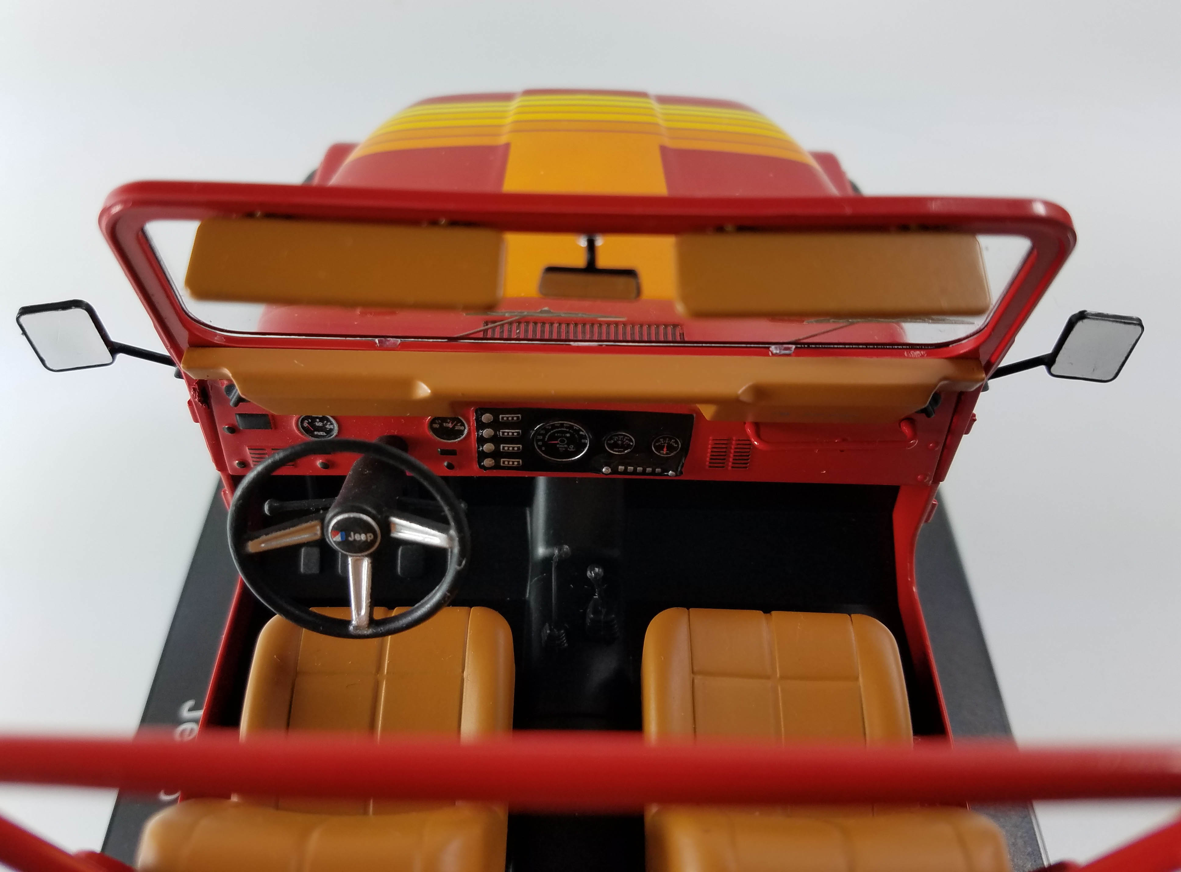 Up front a flat black insert helps set off the 6-bar body-color grille and along the sides the Jeep features flat black wheel well bulges, although those are rather small compared to many of today’s SUVs and trucks. Headlights and the lower lights have realistic looking etched clear lenses while the taillights are squarish and include a white bar atop a red lens. There’s also a molded in and painted gas cap under the passenger’s side taillight and the spare tire is mounted to a black plastic bar that in the 1/1 version would swing clear of the tailgate.