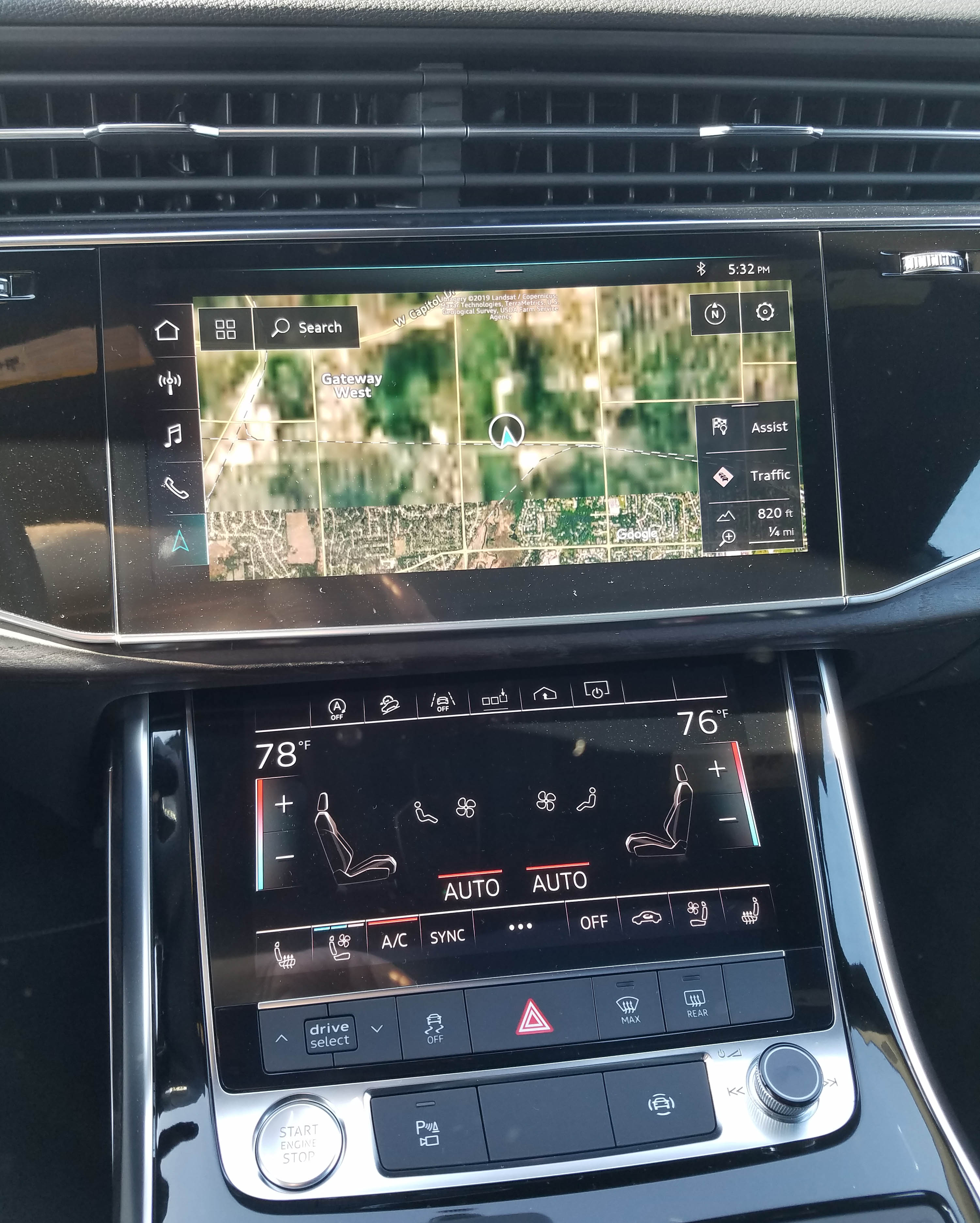 Gone is any oddball radio and info tuning knob on the console. Audi now features two soft-touch screens for infotainment/radio/climate controls/Google navigation. The good news, this is all easy to understand, the bad news is that like some other luxury makes touchscreens, both are touchy. By that I mean that you must press the screens firmly, not just tap them (like a cell phone) to move a setting or access a radio station. The dual temperature gauges also can be adjusted higher or lower by sliding a finger on the screen, but that tended to bump the temp up or down by 4-8 degrees, so slight adjustments take solid screen presses.