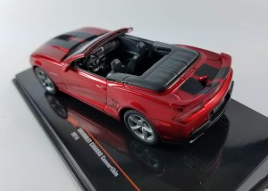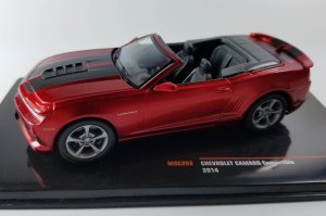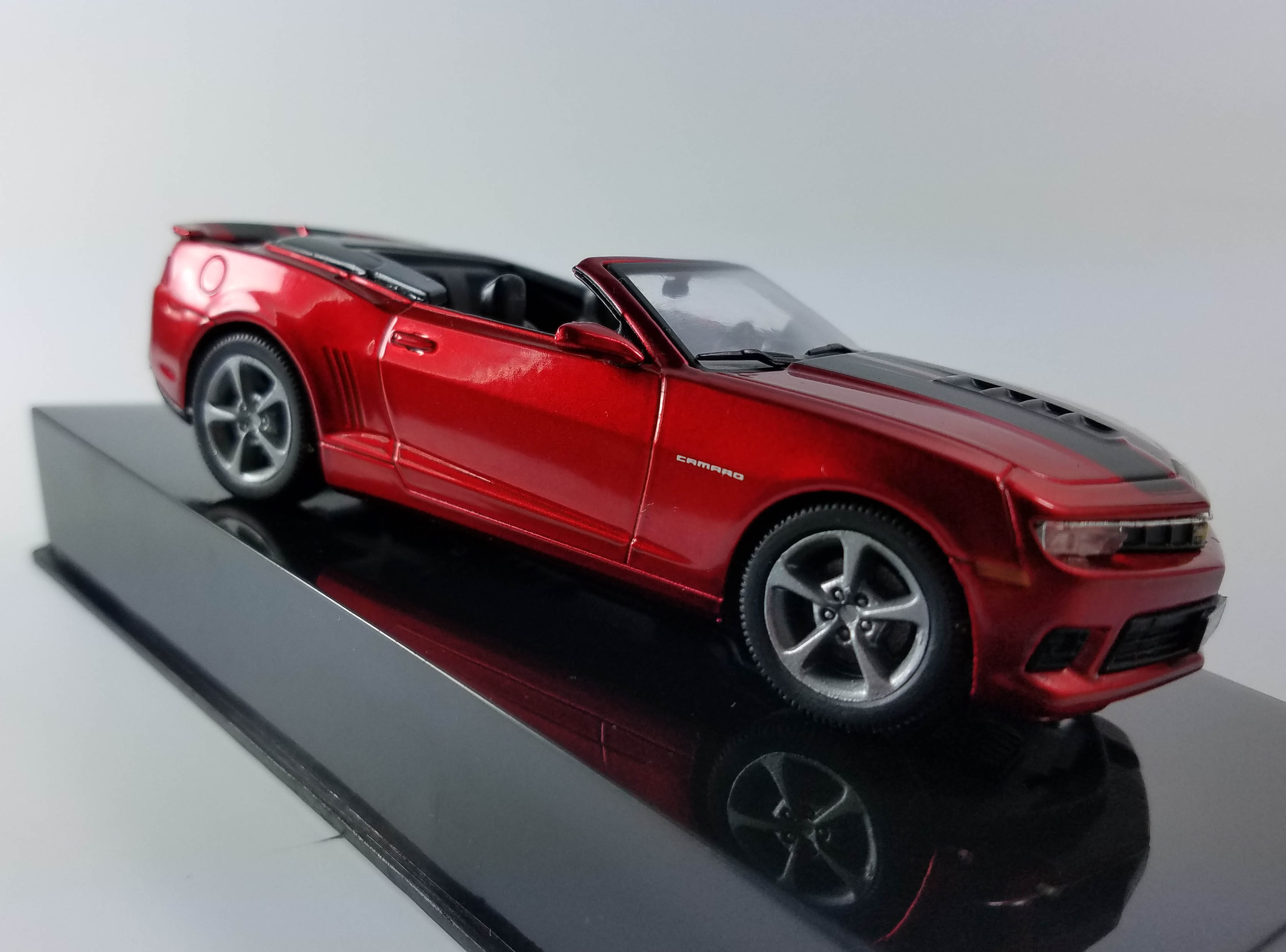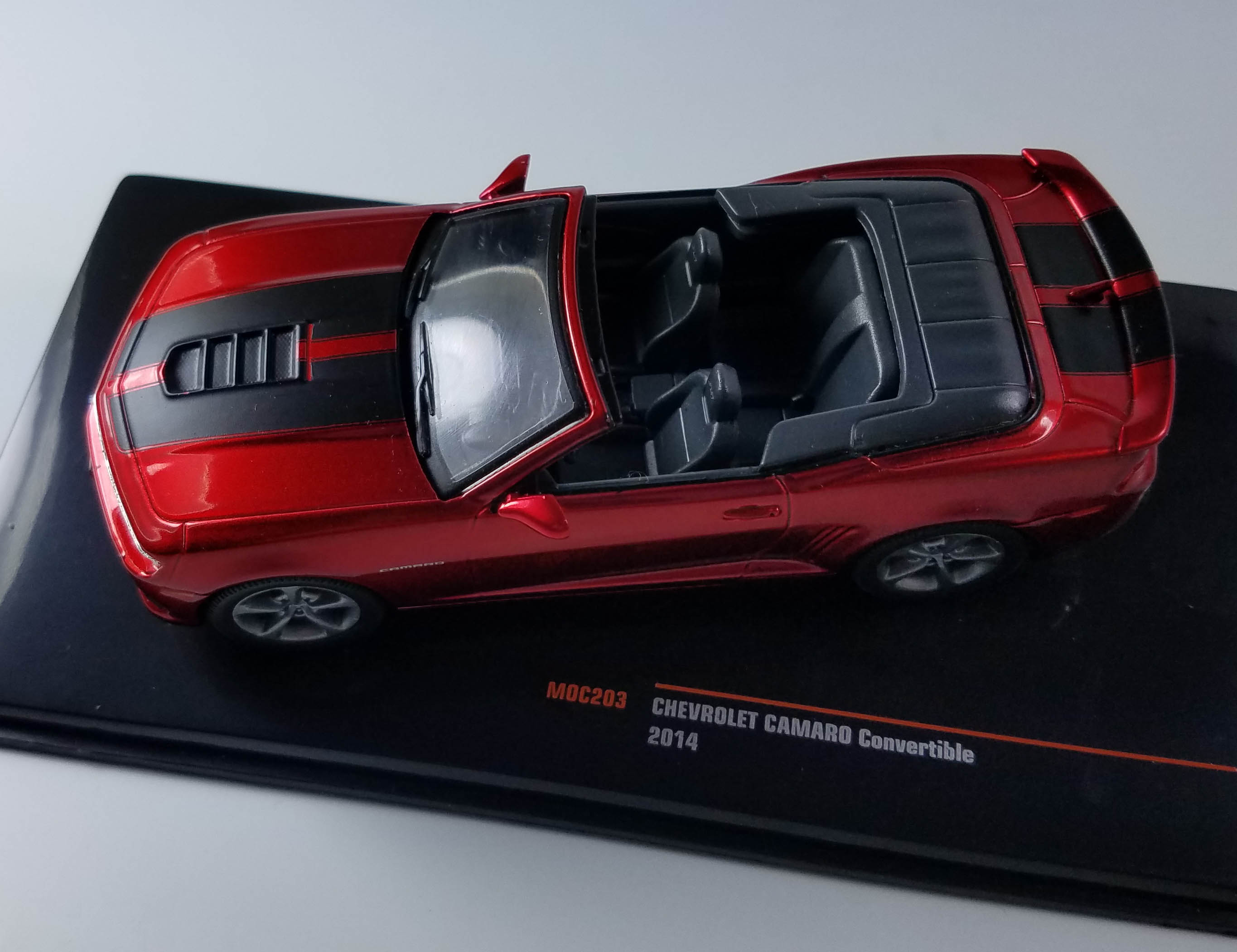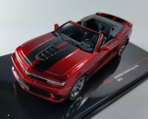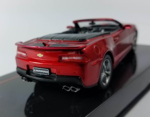 Now IXO releases its 1/43 scale model of the 2014 Camaro convertible in a stunning dark metallic red with flat black hood and trunk stripes. This thing looks fast even sitting on a shelf and IXO wisely mounts it on a black plastic inclined base so it looks more dramatic, like it’s about to charge into action.