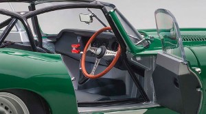 There’s also a hardtop you can affix to the racer, complete with a rear window. But it’s easier to see inside without it in place. And inside, the Jag’s cockpit is particularly sharp with two black racing seats equipped with full shoulder and lap belts and clasps. There are tall chrome shift and brake levers and a wood-look steering wheel with chrome three-spoke hub, each spoke including five drilled holes. The dash is exquisite too with six detailed gauges, a bevy of buttons and red handles to set off the floor-mounted fire extinguisher.