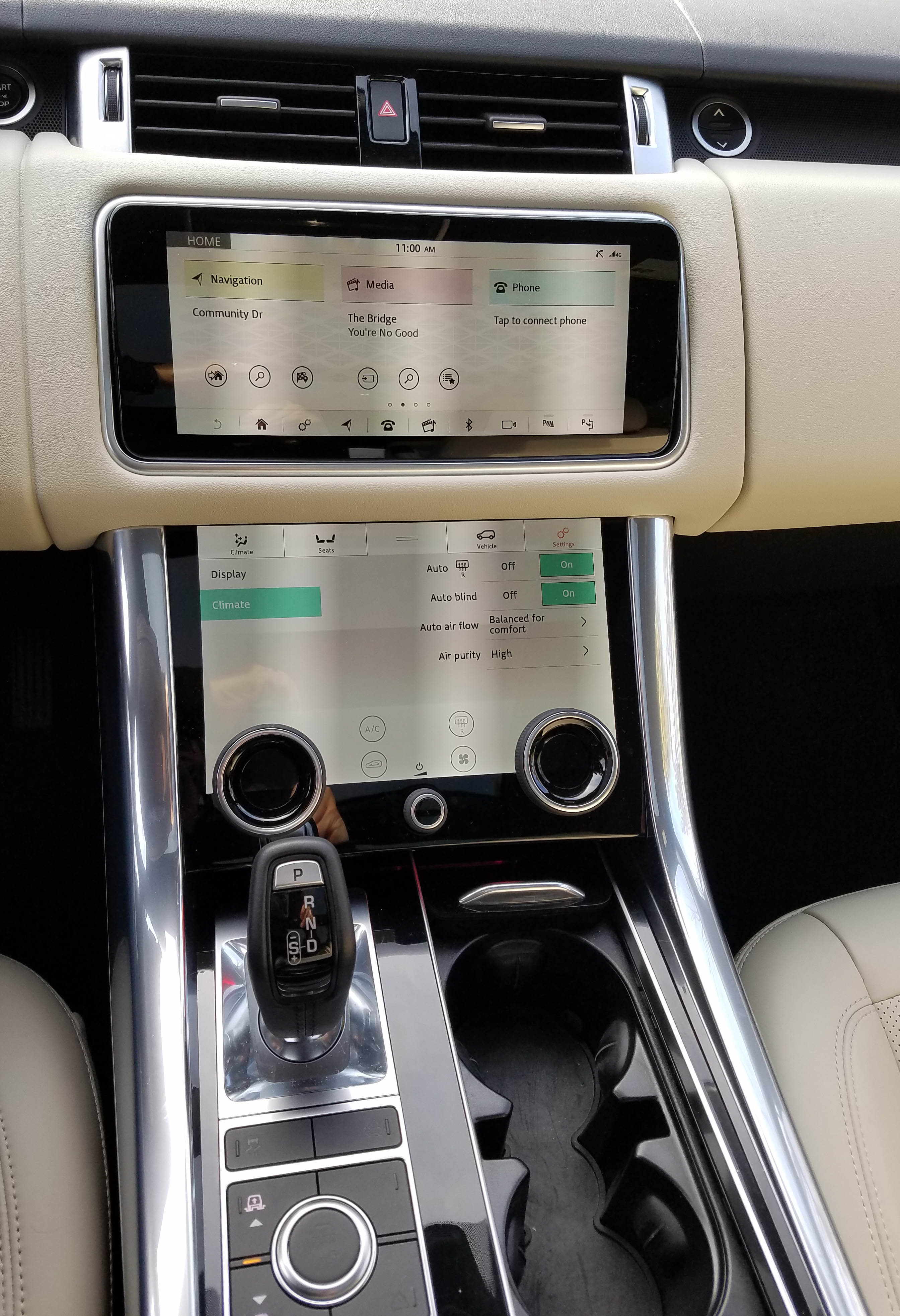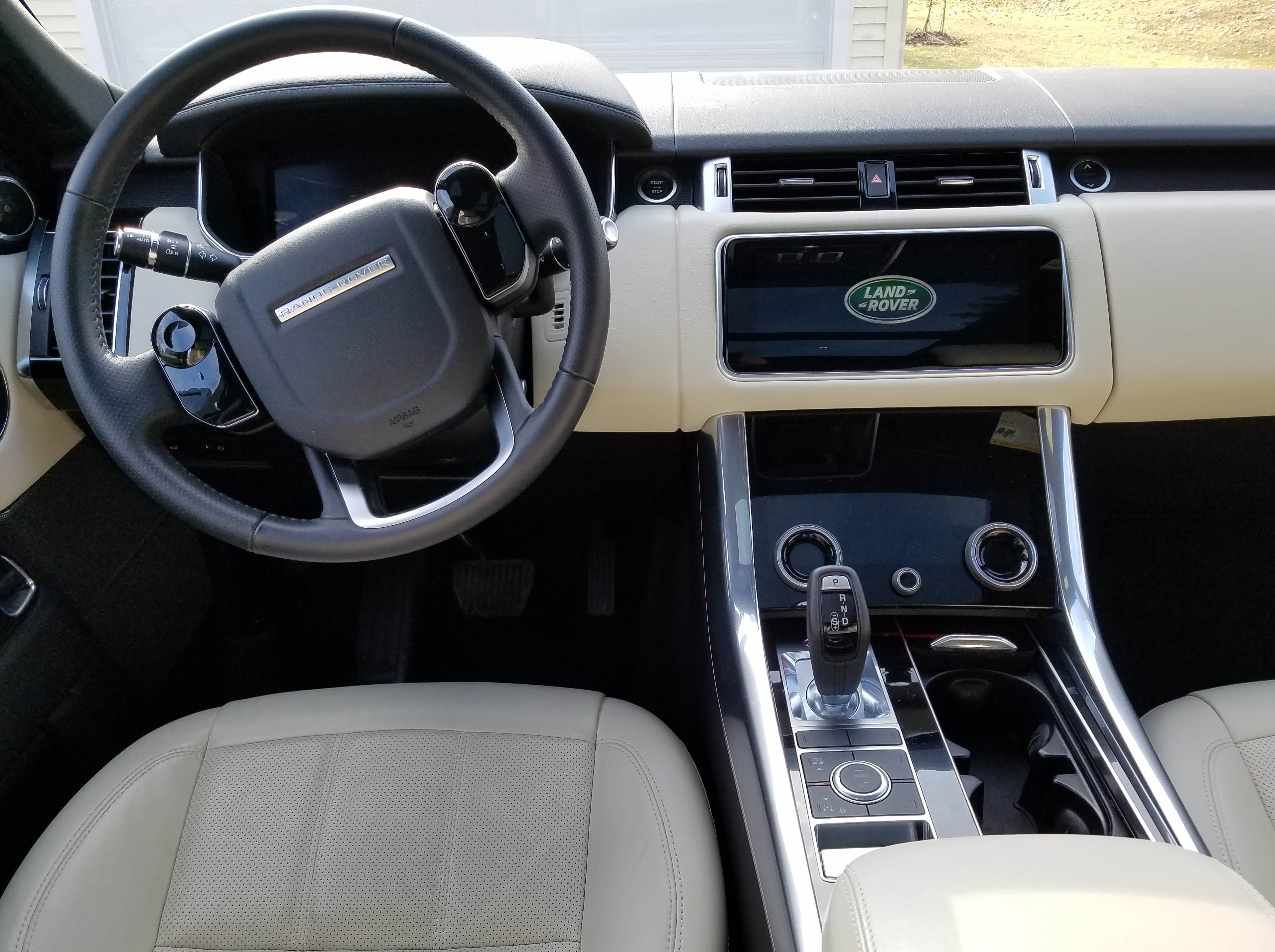I like the truck interior’s clean lines and look. As with the Evoque I tested recently, the dash is designed around two giant infotainment screens, the upper for radio, navigation and such, the lower one for climate and heated seat controls. Both worked, although setting a radio channel and making such adjustments is best accomplished before putting the Rover in motion. Otherwise the task is much more complex than just taping a button as we all did in days of yore.