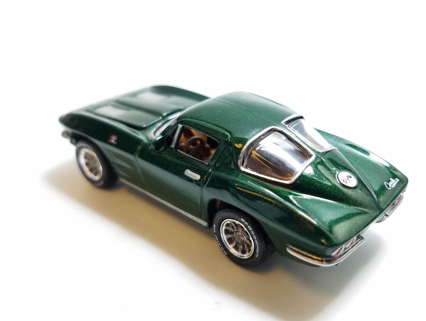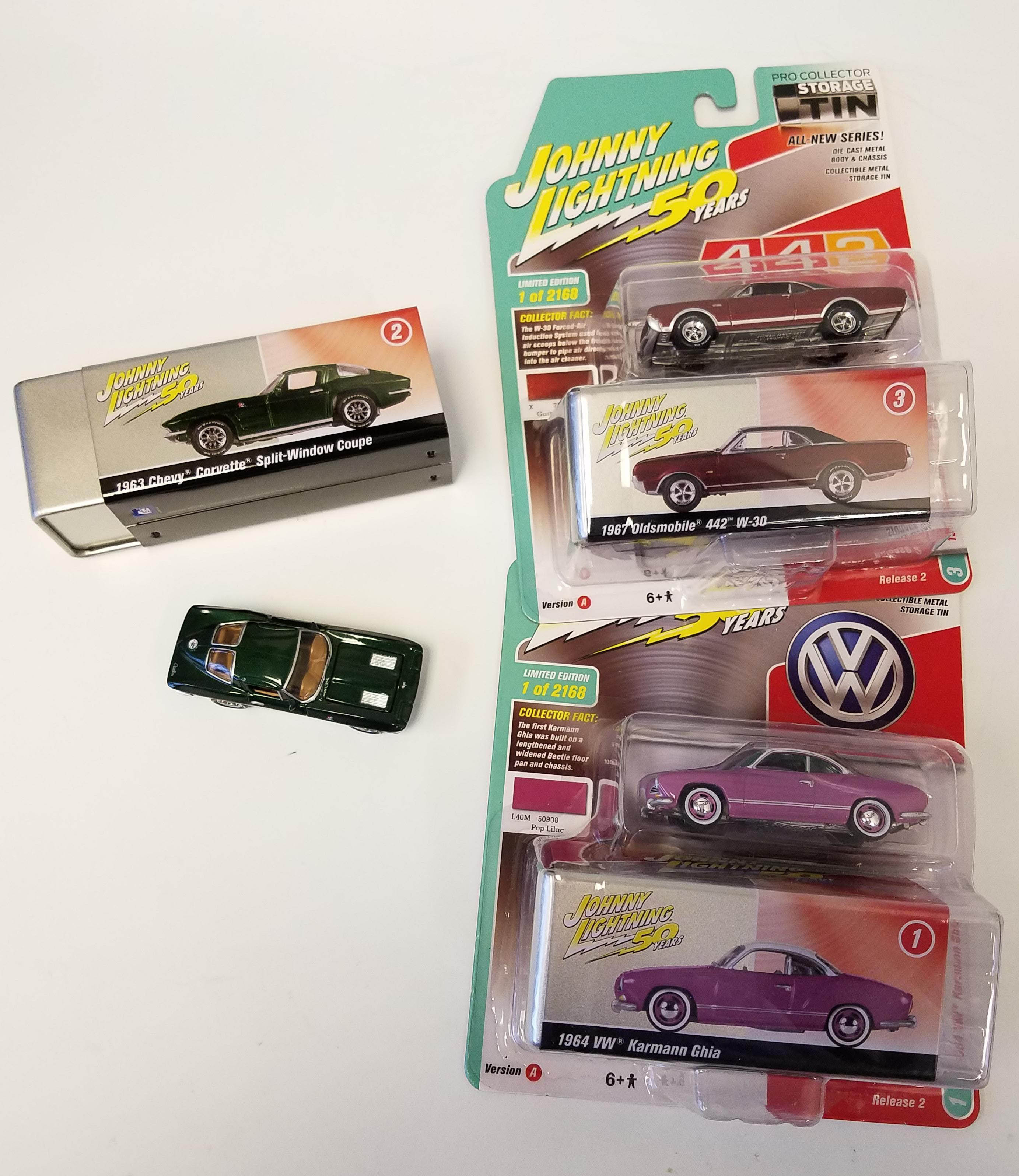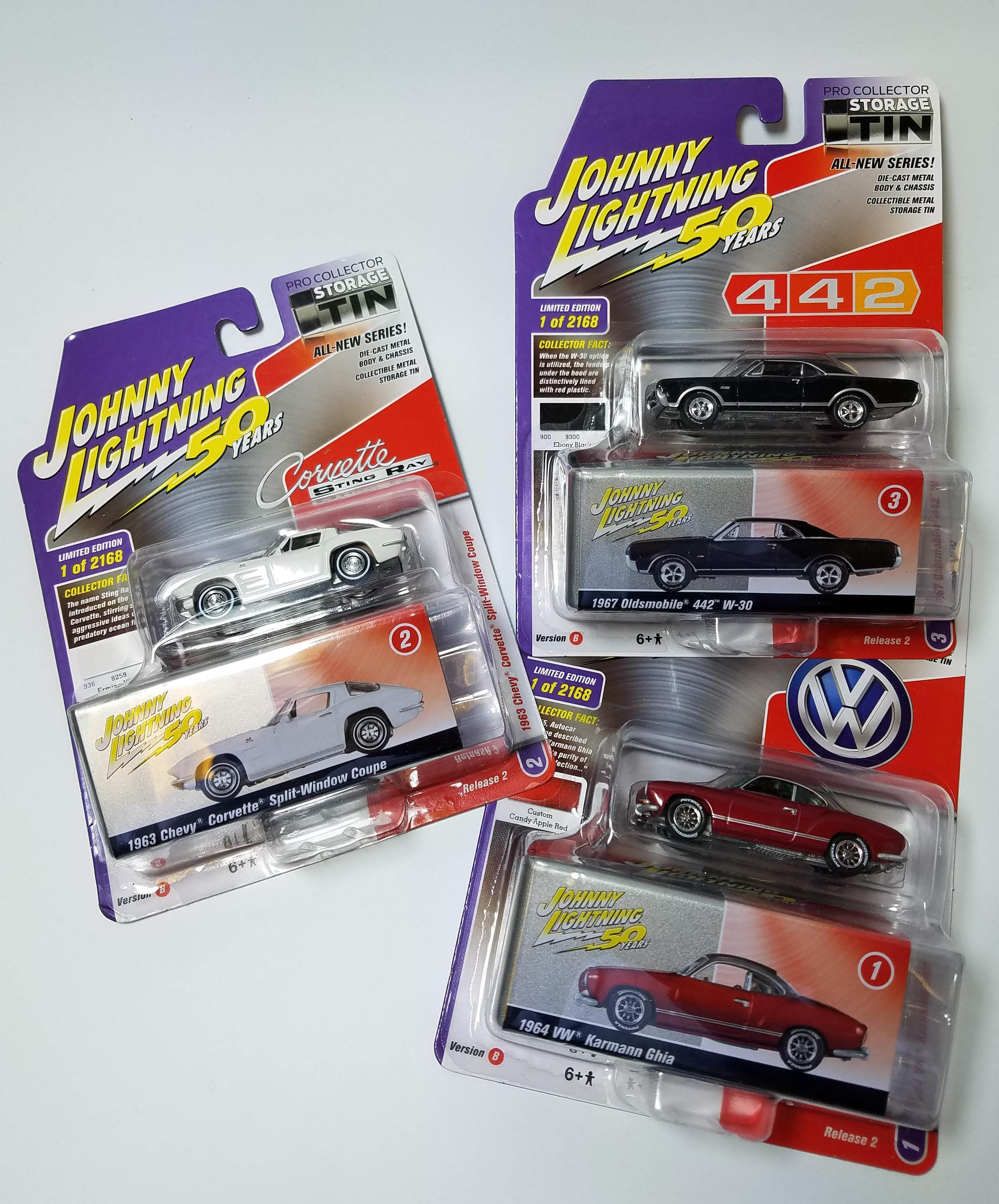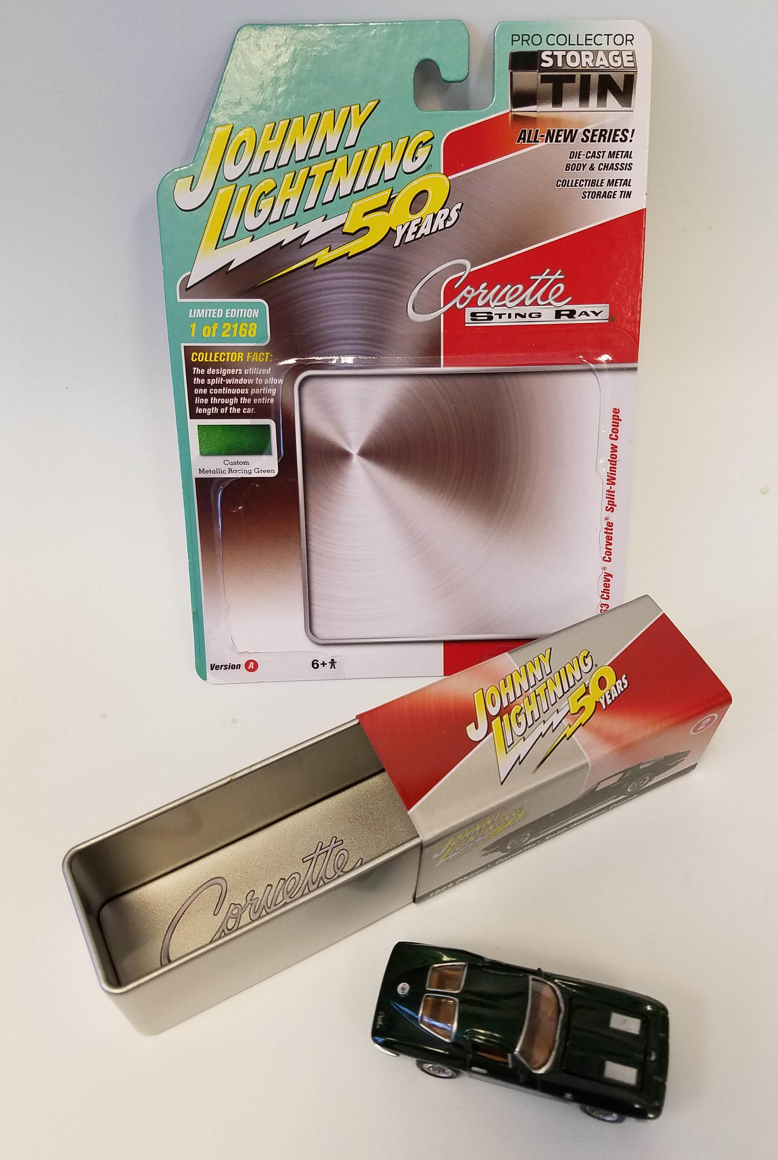 These fancy tins are a big deal. They each feature the Johnny Lightning 50 Years logo on the top, sides and ends, plus that image of the car in the pack, in the correct color no less. I really like that the Round2/Auto World/Johnny Lightning crew didn’t stop there. Inside, on the tin’s bottom where you’ll place the car for storage is the car’s logo and name, for instance Corvette Sting Ray for the custom metallic racing green model you see in the accompanying photos. The tins, which easily slide open and closed, also are numbered 1 through 3 so you can match up the various models, or at least keep track if you misplace one.