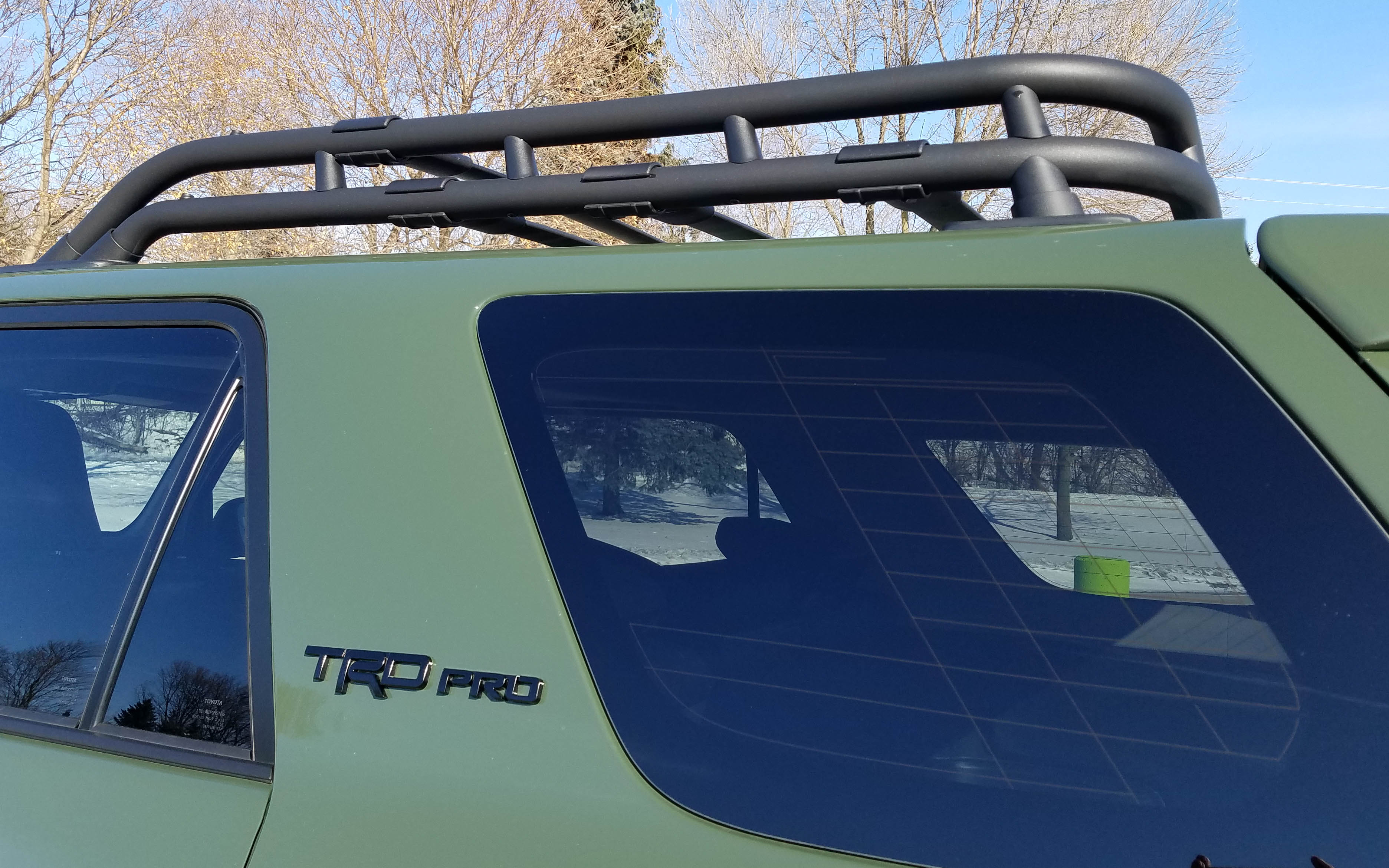 The big hatch in back is manual and heavy, plus it’s also a bit of a stretch for shorter drivers to reach and pull down. And I hate to criticize a car maker for trying a new color but the Army Green on this one is simply unattractive, making this look like either a military vehicle or utility truck. Toyota has used a dull gray for TRD models in the past too. That was too blah, so this is a slight improvement, I guess.
