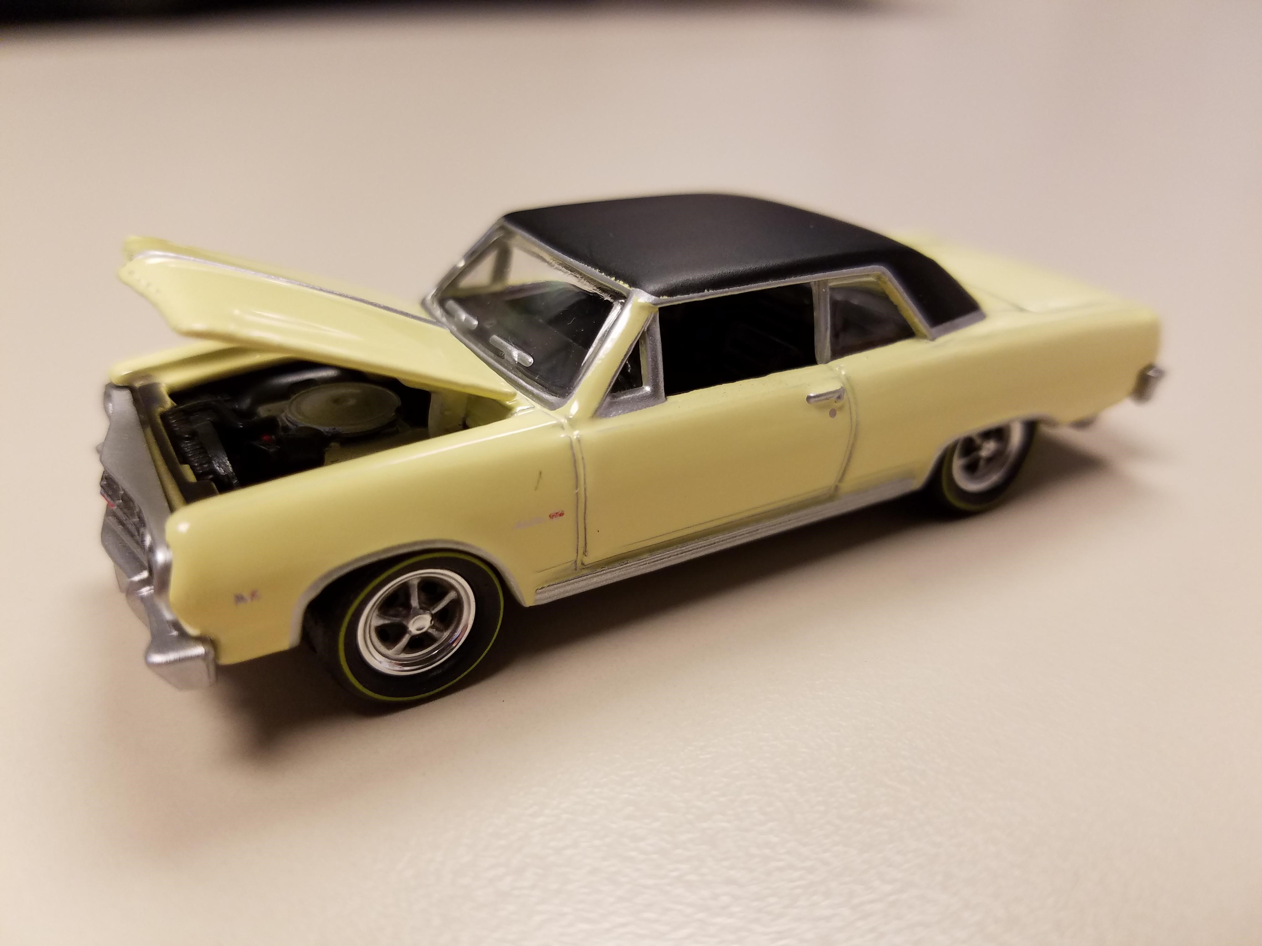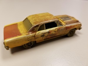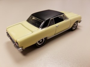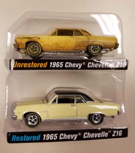 Modelers should love this, just for its theme and the look of a weathered car. Johnny Lightning takes its fine 1965 Chevy Chevelle model and creates the Z16 variant in its unrestored “barn find” state, and then as it appears restored to its creamy crocus yellow with black vinyl top beauty. The display card says these represent a rare Z16 model owned by Jeff Helms, the unrestored being as the car was shown at the 2018 Muscle Car and Corvette Nationals. The Z16, one of just 12 surviving in this color scheme, is being fully restored.