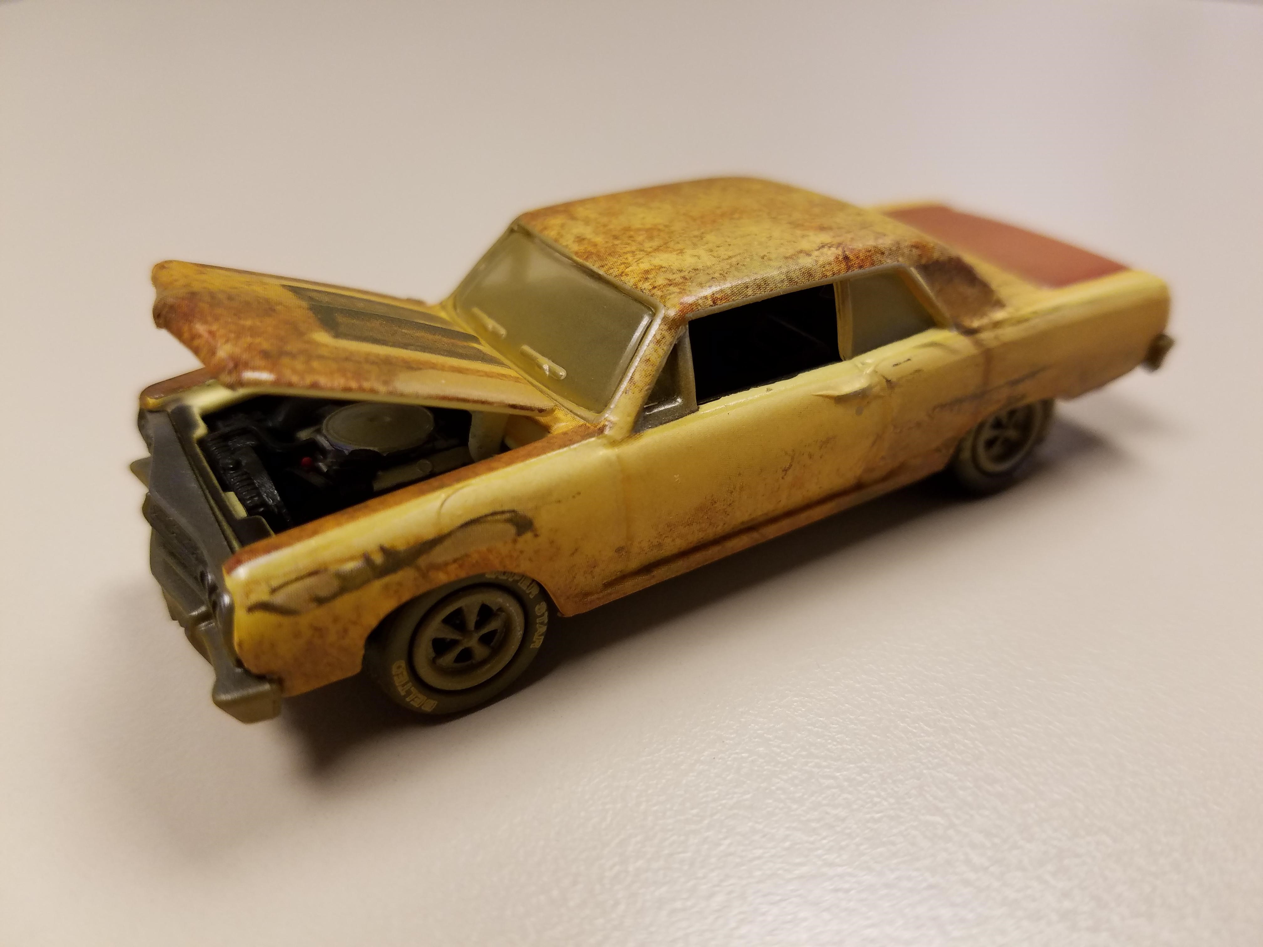 The barn find version features a fine layer of dust and grime on its finish, plus rust spots and scrapes along the front driver’s side fender, a lesser one back over the rear wheel and a bit on the passenger’s side. Paint is faded and there’s a mottled patina to the whole car. The trunk lid is a faded darker brown the front and rear chrome bumpers are dull and gray as if the car has been exposed to dirt and grime for years. The hood features a darkened blackish brown hood scoop that had been attached to the car years ago, after it left the factory.