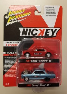 The dealership opened in 1925 and was the first to install Chevy’s powerful 427ci engine into the 1967 Camaro. So naturally this 2-pack includes a red ’67 Camaro SS with white nose stripe and big Nickey logo on either door. Tires are red-stripes and wheels are five-spoke chrome. The interior is black and the hood opens to reveal that big Chevy engine under the hood.