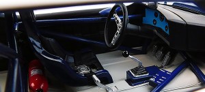 Inside you see the black racing seat with a blue roll bar that crisscrosses the roof, and a well-shaped blue air scoop to deliver fresh air to the driver during a race. A Goodyear logo graces that too.