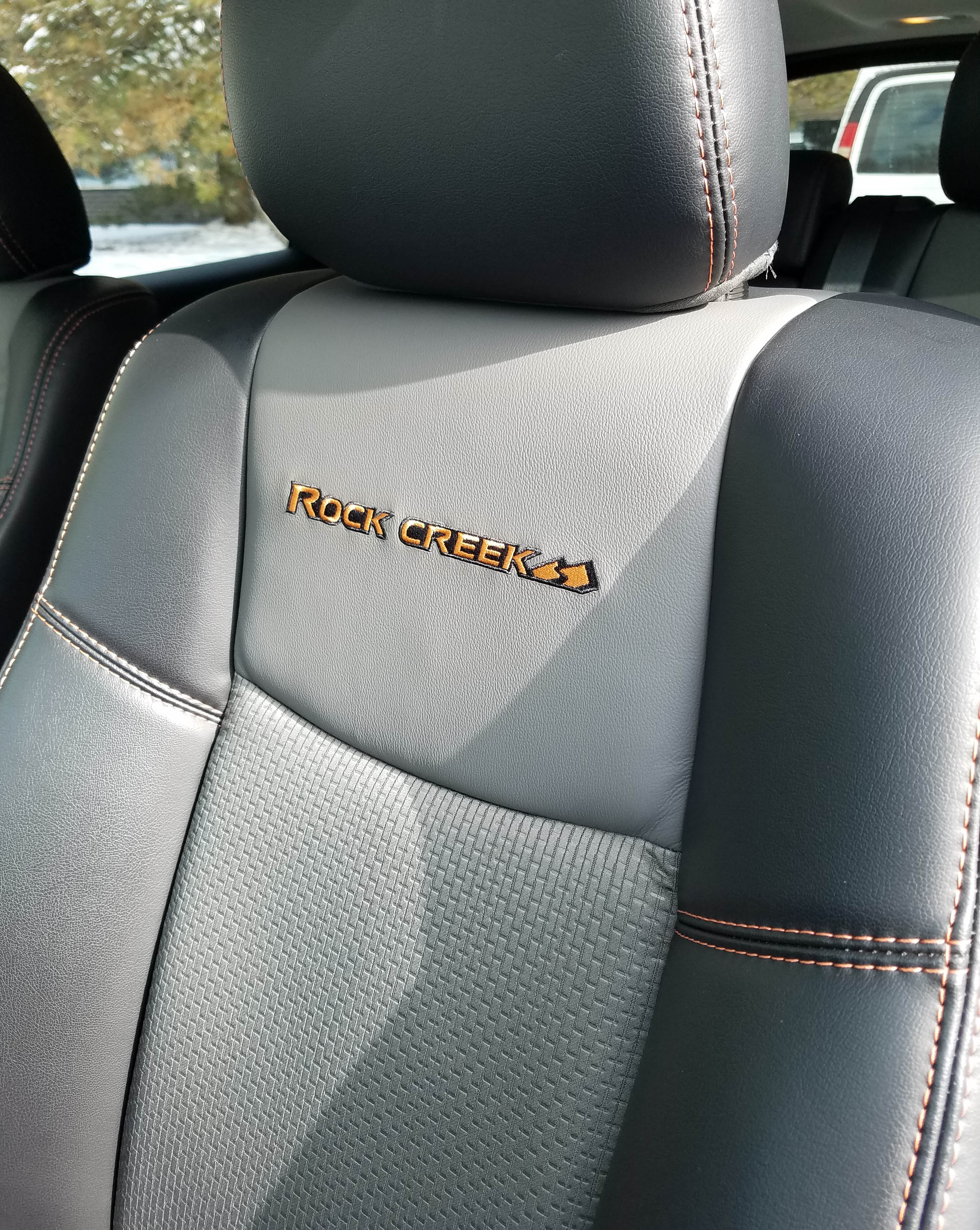 Inside, the test truck was extremely quiet and comfy. Seats were gray cloth with black leatherette trim, orange stitching and an orange Rock Creek logo embroidered on the seat’s back cushion. The dash was black with matte silver air vents and trim, extending to the console and doors. Fake carbon fiber trim decorated the doors, console and center stack’s surfaces.