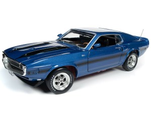 This one comes in a medium metallic blue (Acapulco blue) with black side and hood racing stripes, and like all of Auto World’s American Muscle and similar releases, the doors and hood open while the front wheels also are steerable. Of course, there’s a replica Boss 302 under the hood in this one.