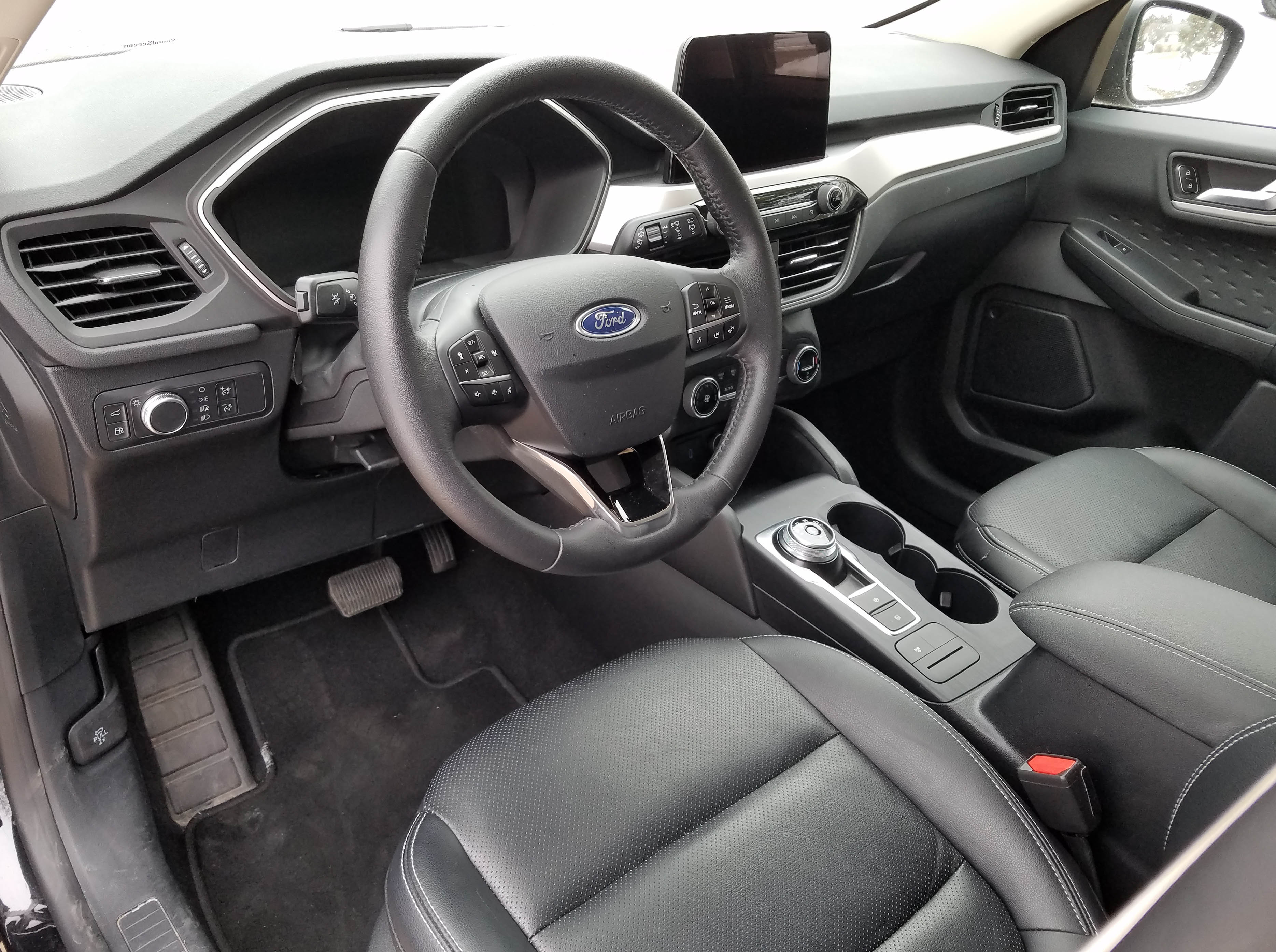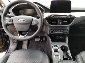 Inside, the black ute had a black textured dash and doors with soft-touch material that made it feel a bit more upscale than past Escapes. Seats were a perforated black leather and the overhead headliner was tan. Escape’s console is textured matte black with a bit of gloss trim by the 8-inch infotainment screen. All trims from this SE on up have that larger screen, the base S model just having a 7-incher. Trim on the door inserts and door handles is a handsome satin chrome.