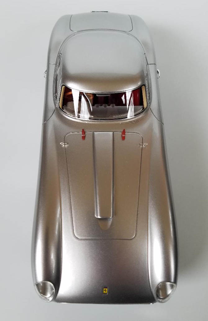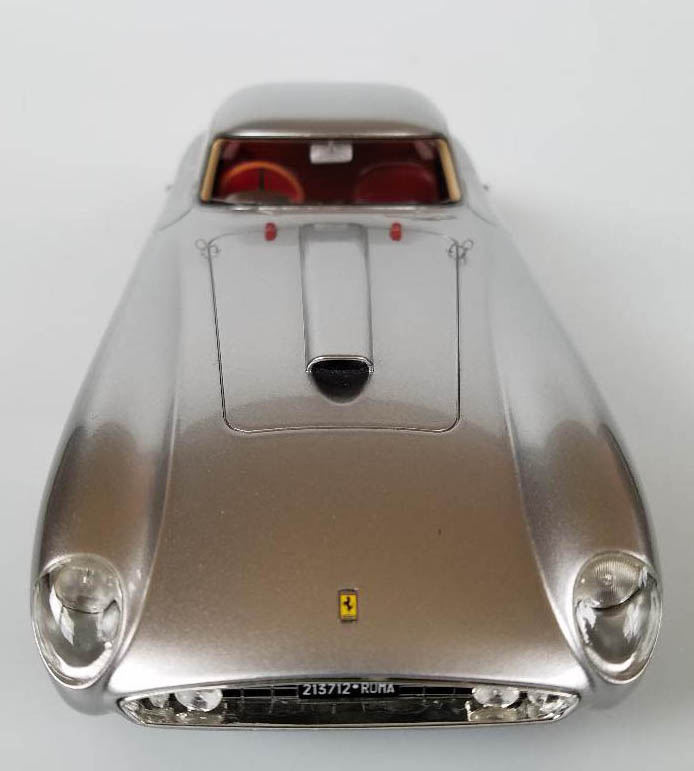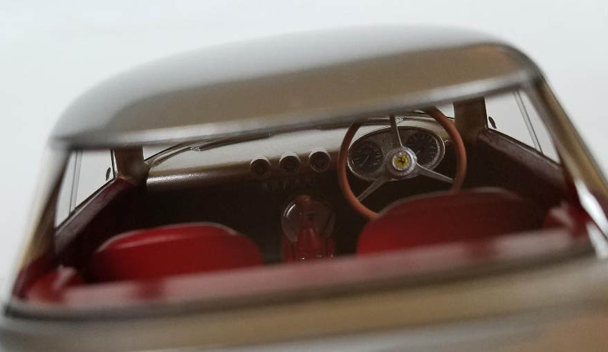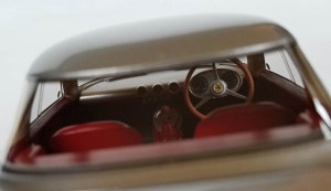 In front are two headlights with clear lamp coverings and a photo-etched metal grille with white running lights and turn signals. In back two itty-bitty red taillight lenses dot the curvaceous Jaguar-esque rear fenders. Remember, most of these cars were racers, so not a big need for large taillights. There’s also a small trunk release in back and a black and white Rome license plate. Doors have beautifully executed door handles with center release buttons visible.