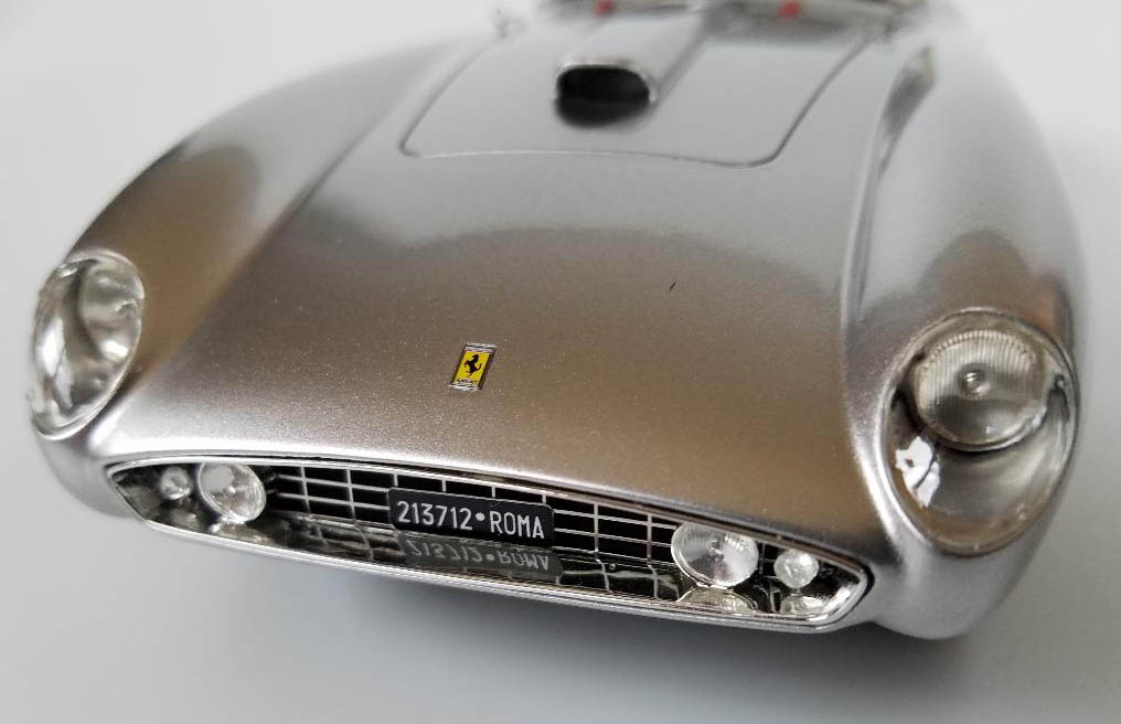 Markings are miniscule, but sharply executed with a rectangular Ferrari black horse logo on the nose and blue, yellow and red Scaglietti Modena logos on the lower front body panel, just in front of crisply executed side vents.