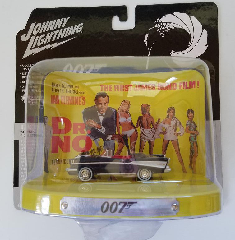 The ’57 Chevy is well regarded as a collector car, but not necessarily one we immediately associate with James Bond. Younger folks (under 65) may have to go watch Dr. No, and the rest of us may need to stretch our memory banks a bit to recall that a bad guy picks Bond up in the black Chevy Bel Air before being dispatched and Bond himself drove it in a chase scene. Johnny Lightning reminds us of another movie fun fact on its hang card. A brief view of the speedometer during the chase scene was actually a speedometer from a Ford Fairlane. Ha!