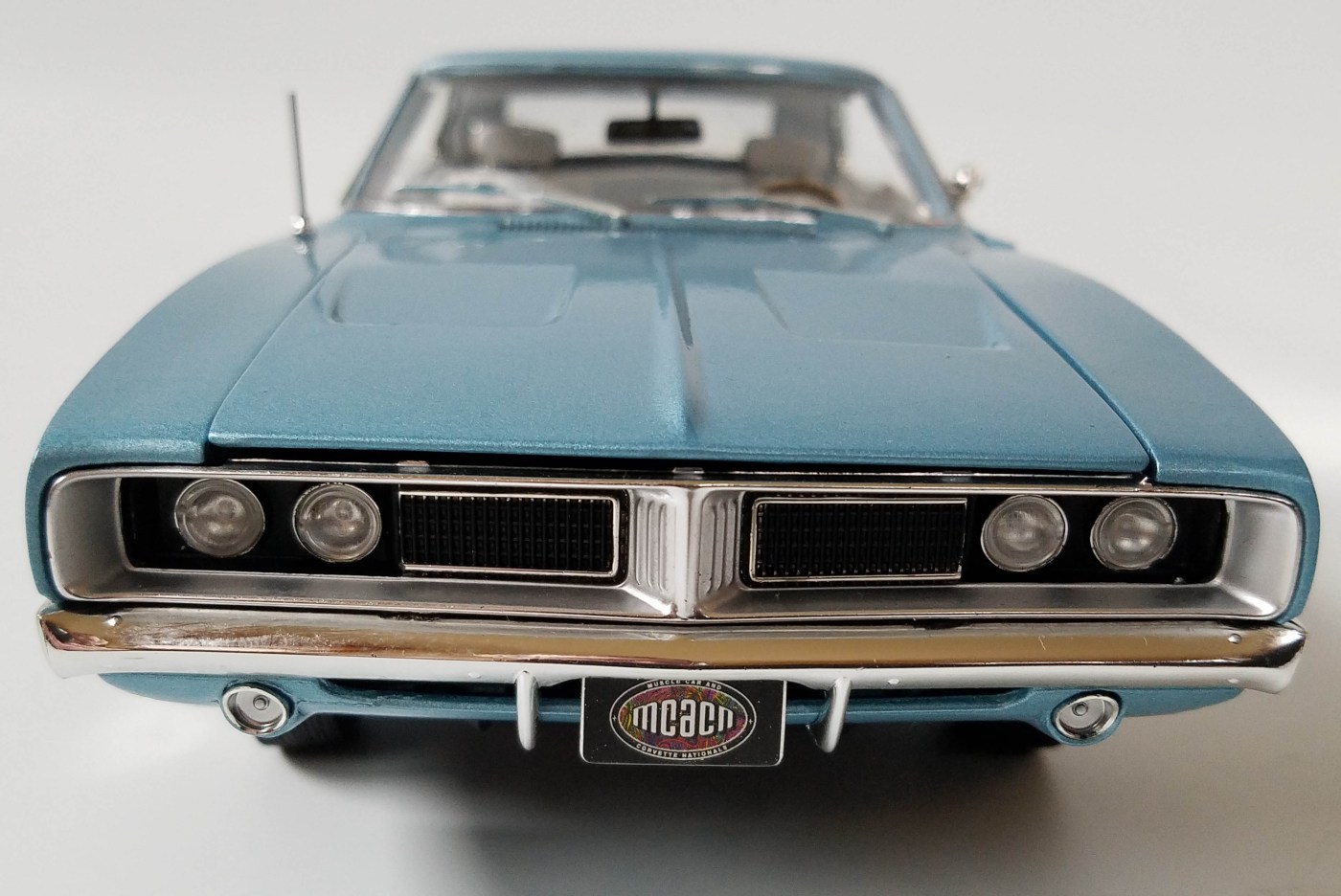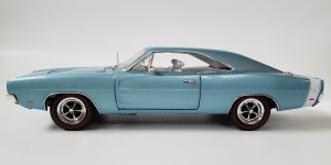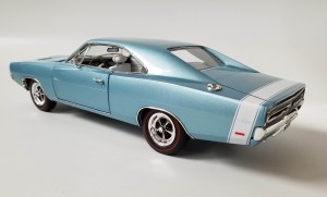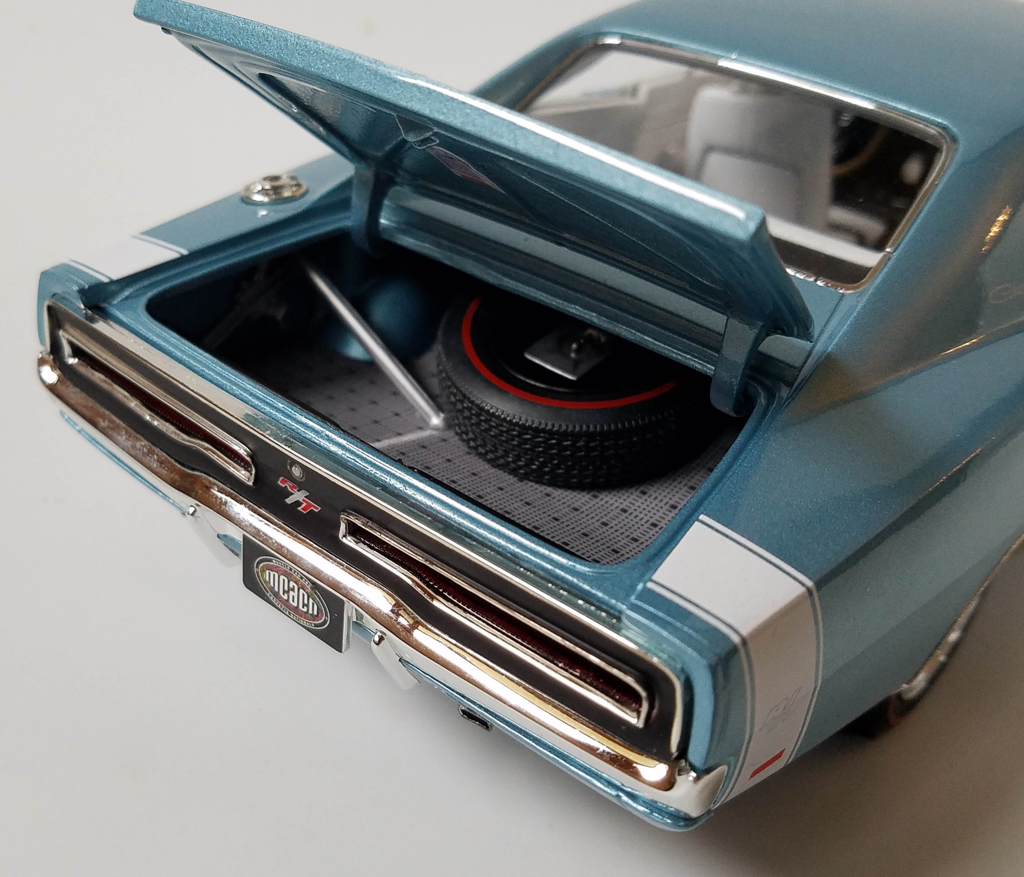 The Charger’s lines are long and lean with a molded-in side accent crease and dual strakes in the doors give the illusion of speed. Auto World does a great job with chrome too for trim over the wheel wells and around all the windows, including vent windows. The shape of the side windows without a B-pillar on the 2-door hardtop is particularly stylish.