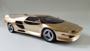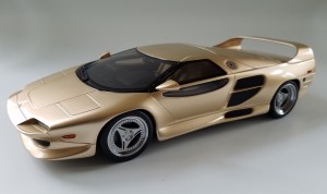 But god love ‘em, BoS (Best of Show Models) took on the project of creating a 1/18 scale Vector M12 from the late 1990s. And honestly, it’s a stunner! Think longer Lamborghini! This is one of 300 models of this limited edition Vector in a handsome gold. A red version also is available. Both are sealed body models.