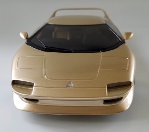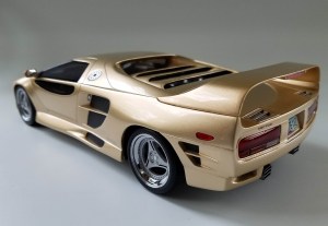 So just finding this sleek gold M12 is exciting and once out of its box and Styrofoam packaging its appearance will impress. The front is typical needle nose supercar with fold-away (sealed here) headlights, but thin running lights along the nose’s leading edge. You can see Lamborghini touches and Ferrari, even Corvette styling in spots, plus a body-colored nose spoiler.