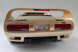 Red taillights look realistic in back, along with twin stacked rectangular exhaust pipes down low. For more detail there’s a 1997 Arizona license plate, the Vector name in black and M12 designation trimming the hatch’s edge.
