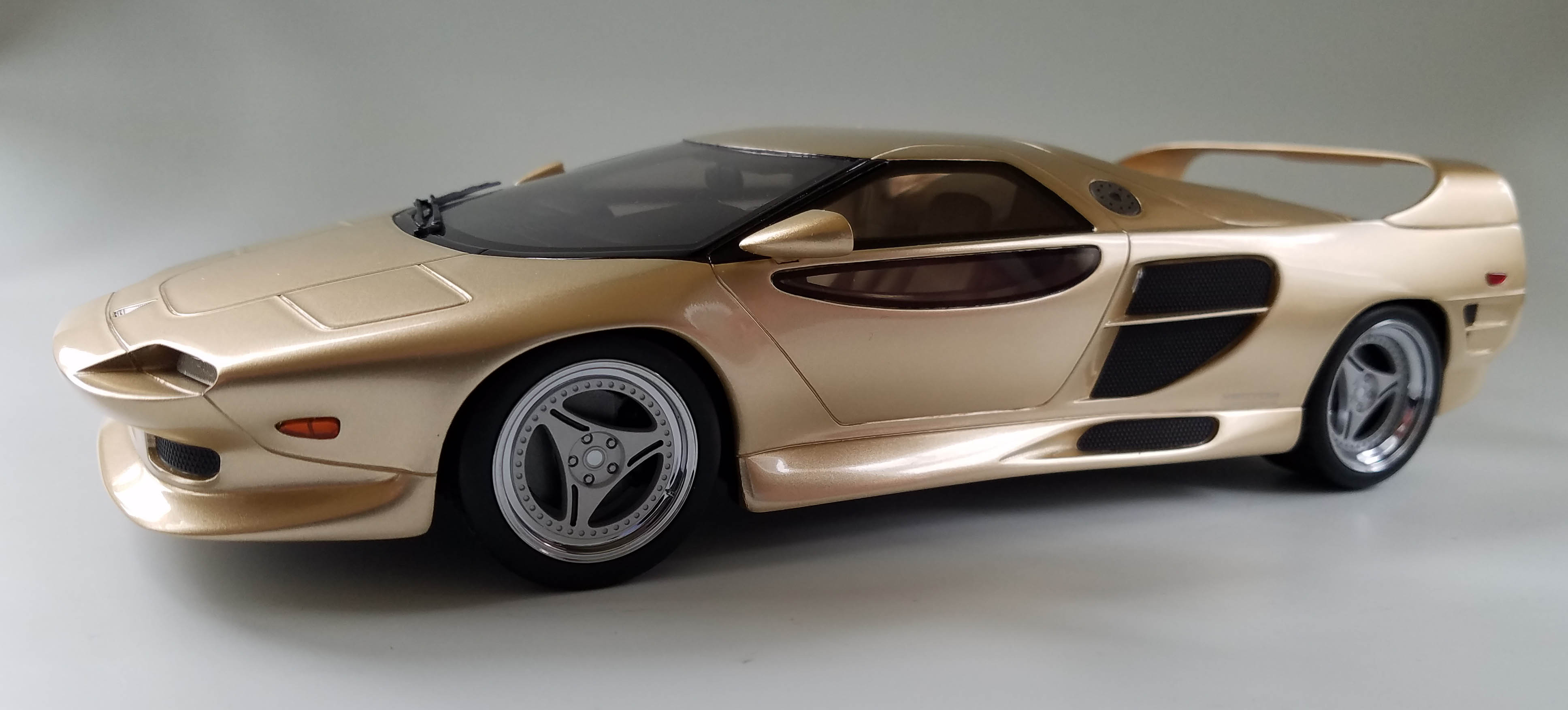 So just finding this sleek gold M12 is exciting and once out of its box and Styrofoam packaging its appearance will impress. The front is typical needle nose supercar with fold-away (sealed here) headlights, but thin running lights along the nose’s leading edge. You can see Lamborghini touches and Ferrari, even Corvette styling in spots, plus a body-colored nose spoiler.