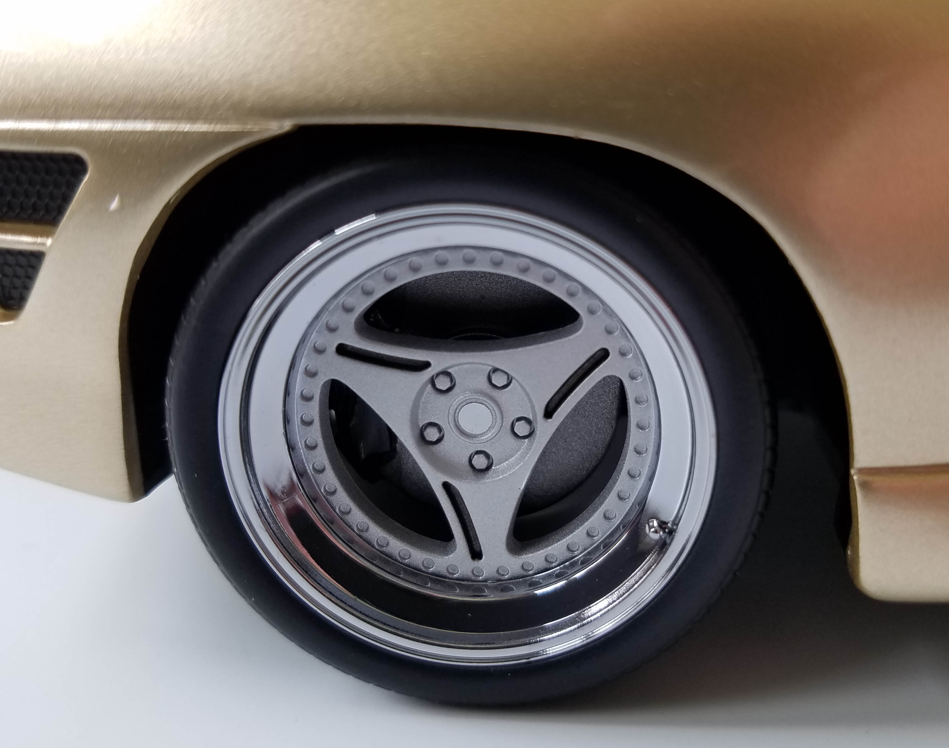 A photo-etched metal fuel filler door rests just behind the driver’s door in the roof pillar and the chrome three-spoke wheels look just like the Vector’s original racy custom wheels. Disc brakes and black calipers are behind the wheels and tires are unbranded low-pros with tread.