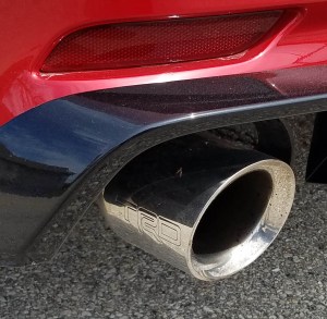 First the visuals. TRD comes with a blacked out grille and nose spoiler, black 19-inch alloy wheels with TRD logos at their center, red brake calipers and a black diffuser under its tail along with black ground-effects moldings along the car’s rocker panels. Inside there are TRD logos on the seat headrests and fancy black and red TRD carpeted floor mats and cargo mat.