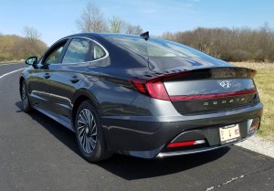 And then there are a couple other hybrid-only features to note, but only one you’ll notice. The hybrid’s trunk lid flips up a bit in back to provide a bit of a rear spoiler for aerodynamics. Likewise, Hyundai has placed panels under the engine and along the undercarriage’s sides, from the center to the tail, to smooth its underside for better air flow and an MPG boost.