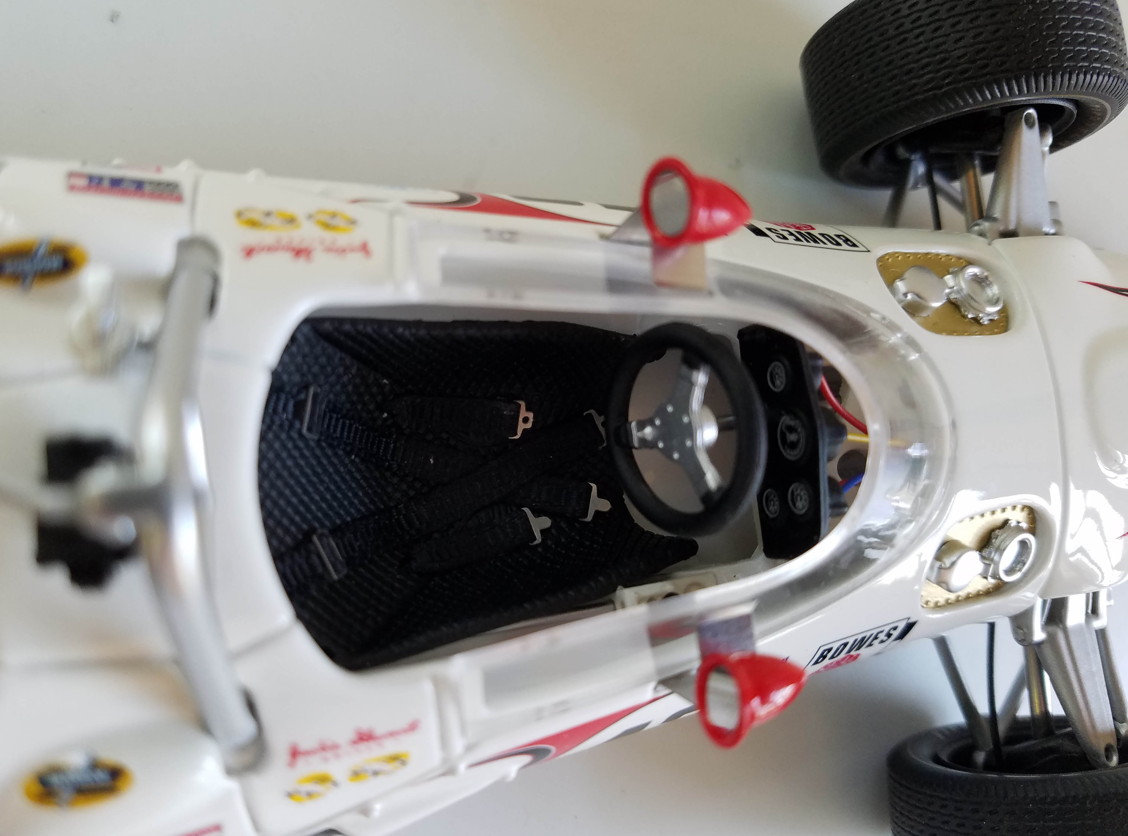 The cockpit has a black low-slung seat with seatbelts and photo-etched metal buckles, while the steering wheel is black with a silver three-spoke center. Dash includes four gauges and wiring that runs under the windshield into the car’s nose. Plus there is a small gearshift on the cockpit’s right side.