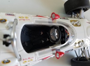 Just in front of the cockpit are two fuel filler nozzle hookups and a thin flat silver roll bar projects behind the cockpit, in hopes of providing the driver at least some protection if the car turned over. I particularly like the metal supports that look like small shelves on either side of the cockpit to hold bright red rearview mirrors.