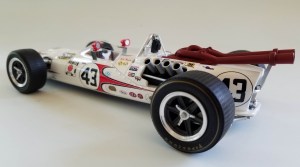 There are plenty of sponsor logos as that was becoming a thing at Indy in the 1960s. Prominent on the cockpit’s sides is the Bowes logo in a checkered box, plus Stewart’s name in script at the rear of the windscreen on the cockpit’s sides. A few of the better known logos atop the engine cover include Premier, Monroe, and Magnaflux, while Champion and Bear are further down the body’s side, as is STP, and Mobil is next to the side numbers.