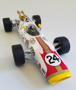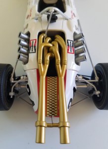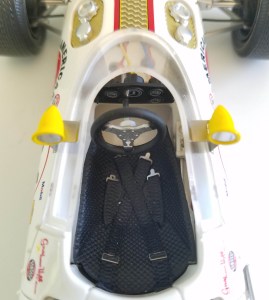 Cockpit mirrors are on aluminum stands as with the Stewart car, but are yellow here to match the nose. Again there are photo-etched seatbelt clasps, a black seat and black three-spoke steering wheel in the cockpit along with short shift lever on the driver’s right. Four gauges are seen on the flat dash with wiring receding under the windscreen into the car’s nose.