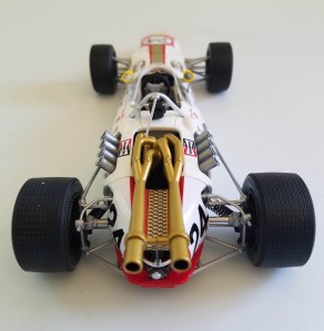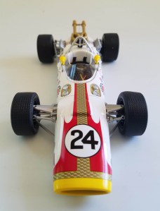 Stewart’s car was primarily red and white, but Hill’s was too, yet with the noticeable difference that there was a yellow ring around the nose, and gold racing stripe up the nose to the cockpit along with its snake-like tailpipes painted gold.