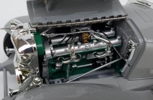 Chrome also surrounds the wind screen that is angled back to accentuate the car’s sleek appearance, plus includes clear vent windows attached to the chrome windshield frame. A sharp chrome hood ornament also adds realism.