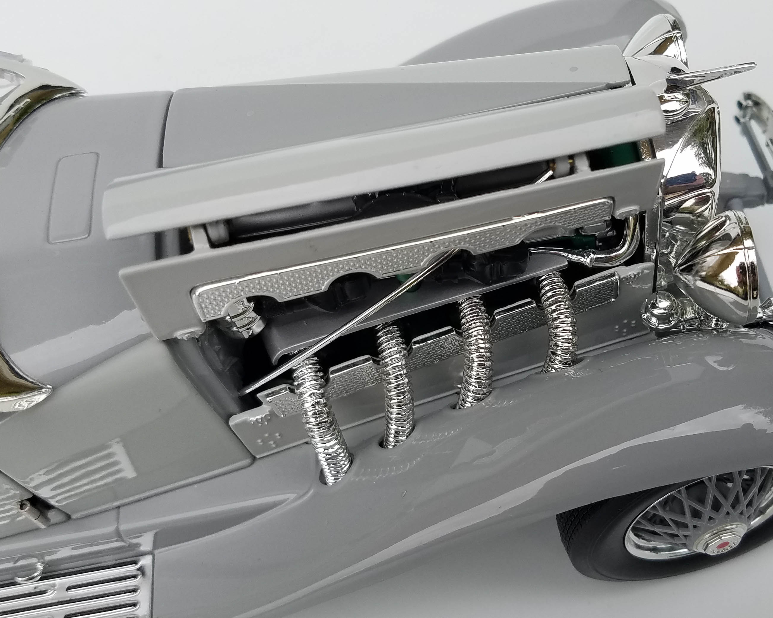 Naturally you can pose either side of the hood up, or down to display the SSJ’s sleek lines, but the doors also open, the wheels are steerable, so posing this model offers several options. Chrome seems a bit over bright to me, but then there’s so much of it, the running board insets, the grille, headlights and bumpers, plus side screens on the hinged hoods.
