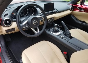 Mazda also has developed the most spectacular red paint color, Soul Red Metallic, that some of us Boomers think looks a lot like Candy Apple Red from our youth. It sparkles like a diamond in the sunlight, and it’s only $595 extra. The color upgrade was the only option on my test car, the MX-5 RF Grand Touring.