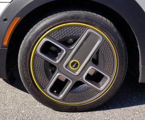 Outside the test car was its white silver shiny self with bright “electric” yellow accents and mirrors, plus a black roof. It looked sharp and garnered comments from neighbors. Folks liked the flashy semi-enclosed wheel covers too. Those only come on this upscale Iconic model. They look slick and one imagines them helping cut wind resistance.
