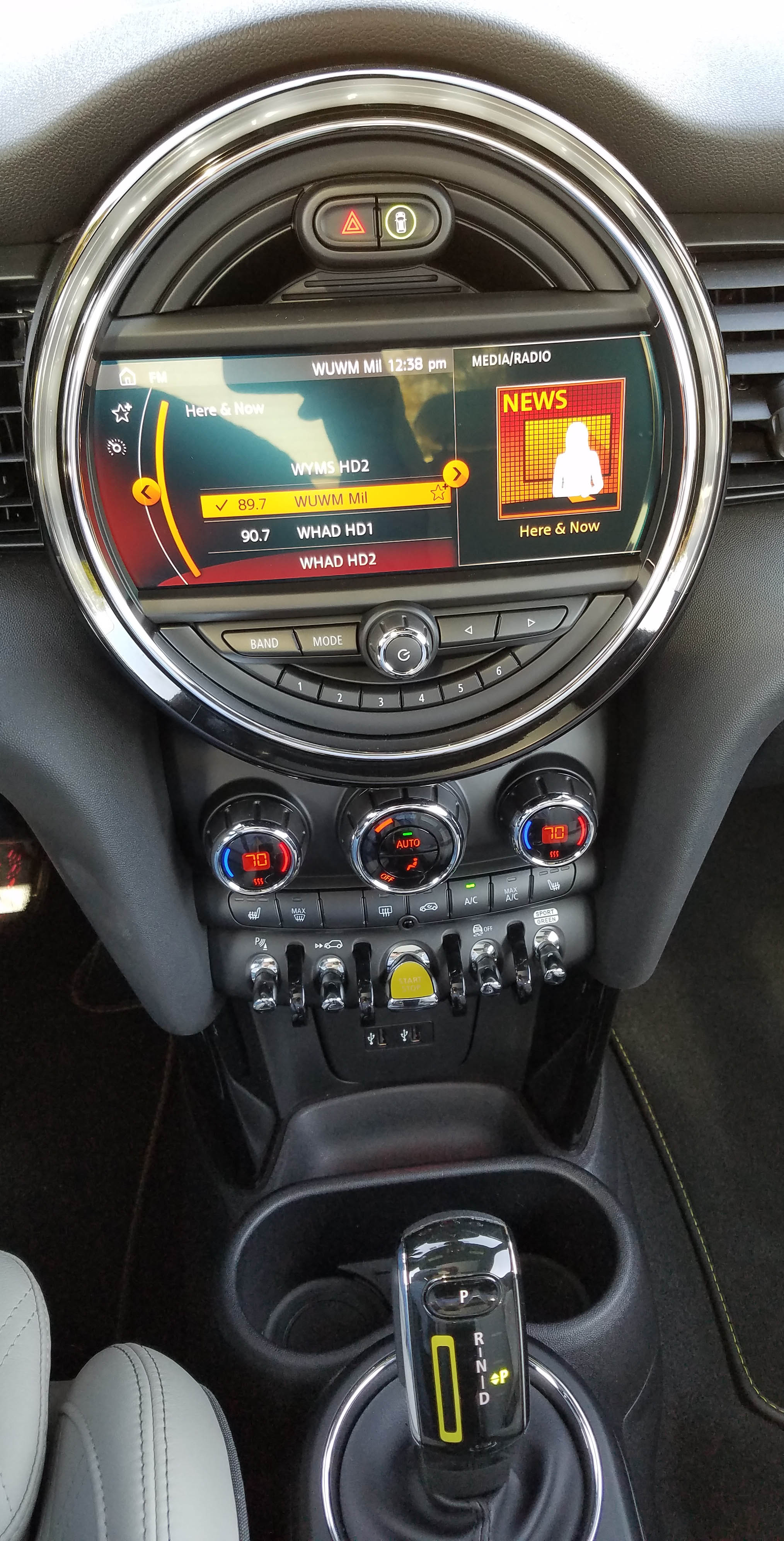 Iconic models, which cost $7,000 more than lower trims, also include power folding mirrors, park distance control, parking assistant, a special Harmon/Kardon high-end stereo, navigation package with Apple CarPlay compatibility, MINI Connected and nav, naturally. Plus there’s a wireless phone charger in the small center armrest.