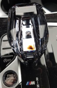 The steering wheel is M-branded (but not flat-bottomed) and black leather, and the dash is tightly fitted with dark gray stitching. Trim is pewter and there’s a crystal gear shift knob, which is suddenly a thing in high-end vehicles. Dash and console trim features a black wood look with pewter edging in spots.
