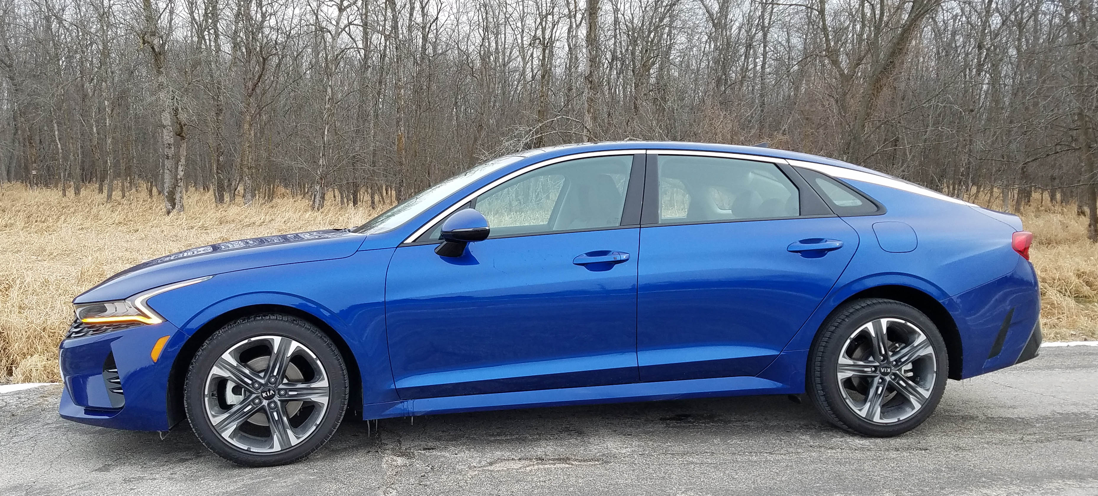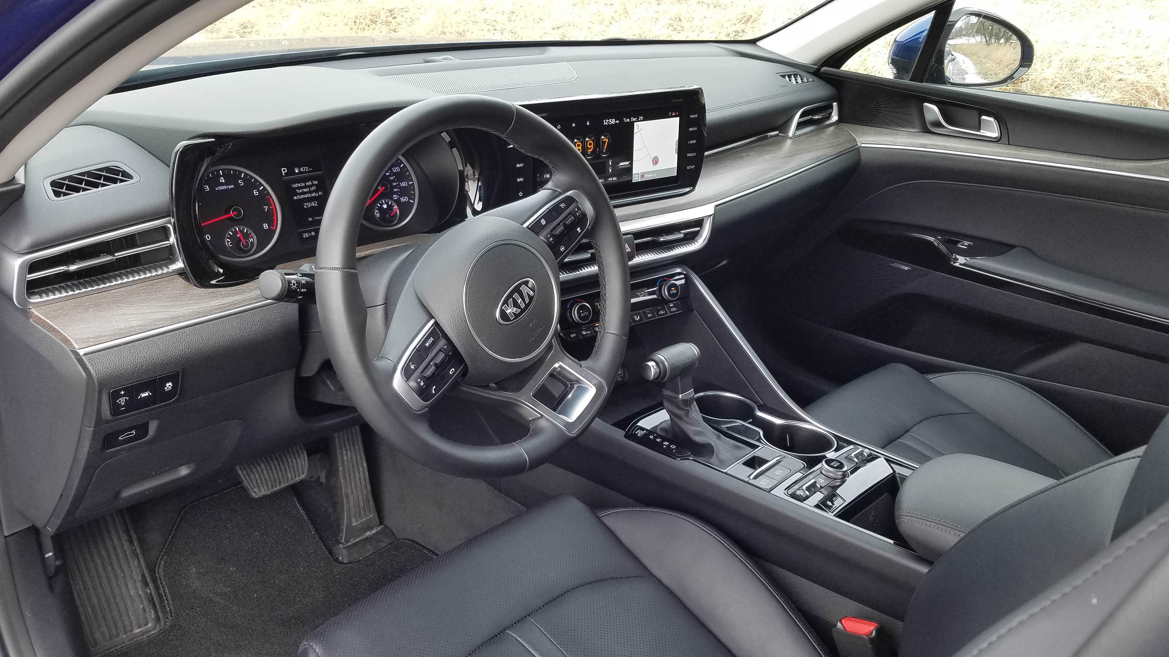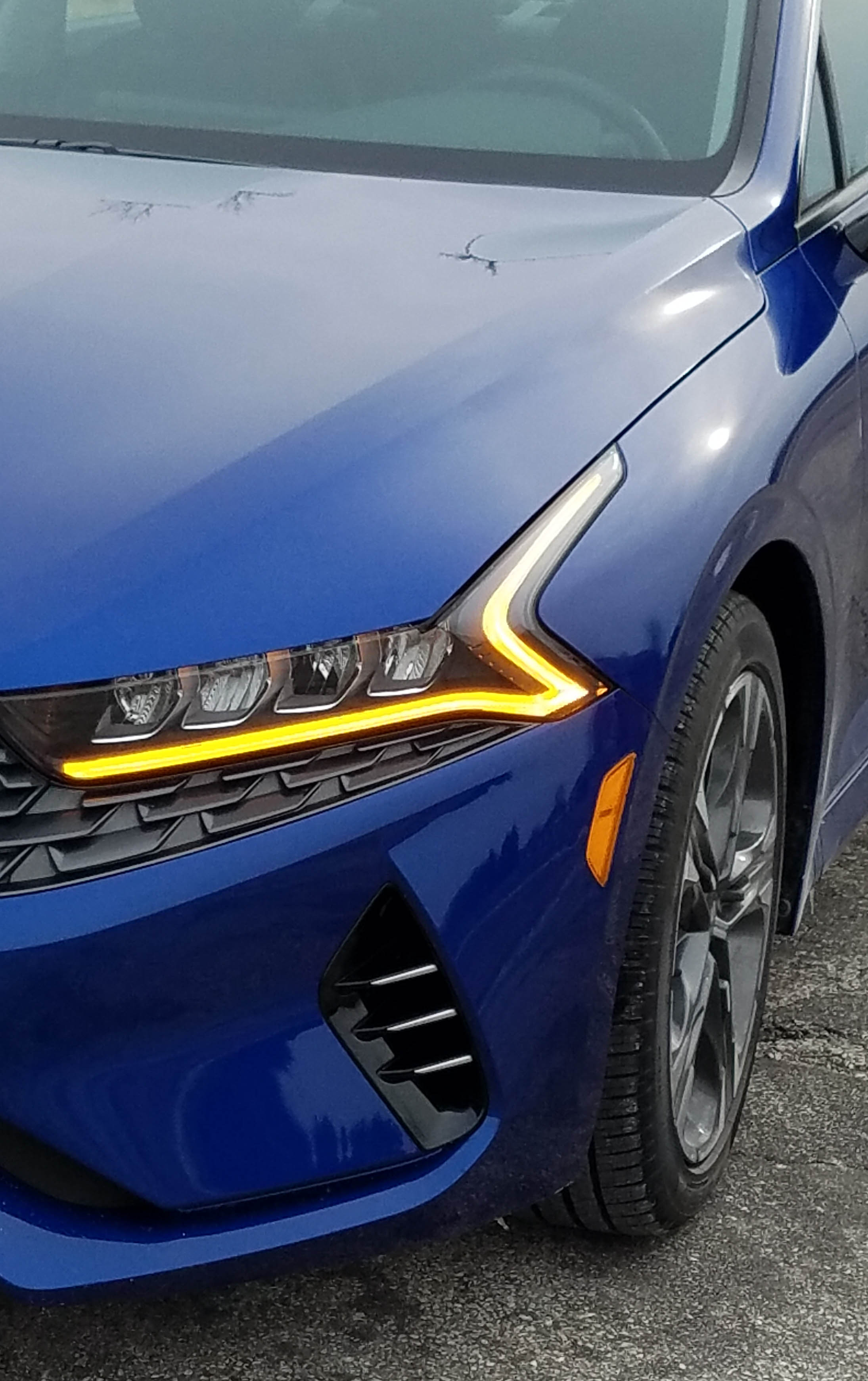 The tested Sapphire Blue (gorgeous) test car was the next to top-level front-drive EX trim, but know that Kia now offers AWD (about $2,000 extra) on all but the base K5. The sedan now rides on a new chassis that’s longer, wider, and lower than the Optima it replaces. In the old days, that’s the sort of thing Pontiac boasted about.