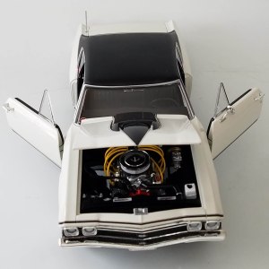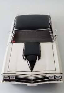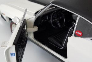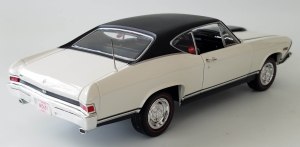 That’s what Round2, via its Auto World American Muscle brand, delivers in its new 1:18 scale 1968 Nickey Chevelle. It’s decked out in Ermine White with a flat black (vinyl) roof and sharp gloss black Stinger hood scoop. And like most American Muscle die-cast metal models, this one retails for $99.99. That’s high value for a model with detailed engine, interior and undercarriage.