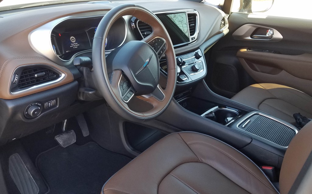 This beautiful Maximum Steel Metallic (sparkly bluish pewter) delivered a luxury look and feel interior that might surprise a first-time minivan buyer. Seats were a saddle brown with mocha brown piping and the dash and doors were brown and black, a spiffy look. Trim is all satin chrome behind gauges along with air vents and door release handles. The console and surround of the big 8.4-inch touchscreen are trimmed in gloss black. Chrysler nails the look!