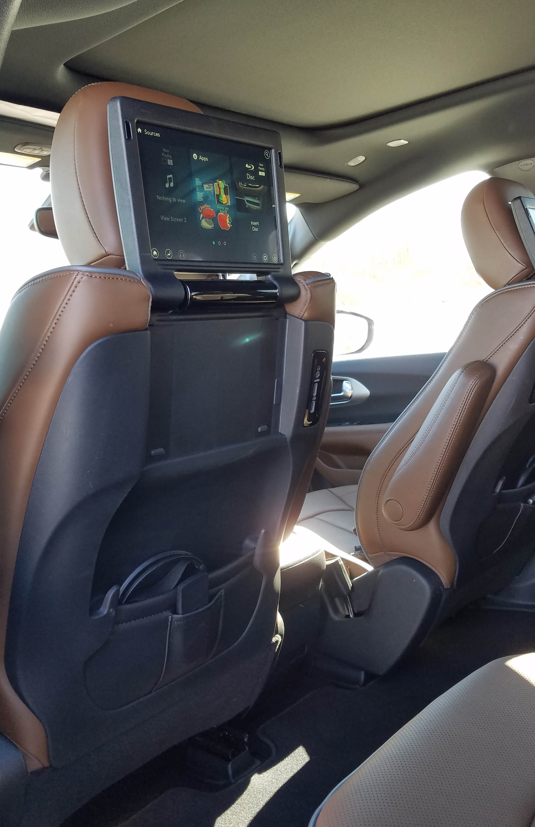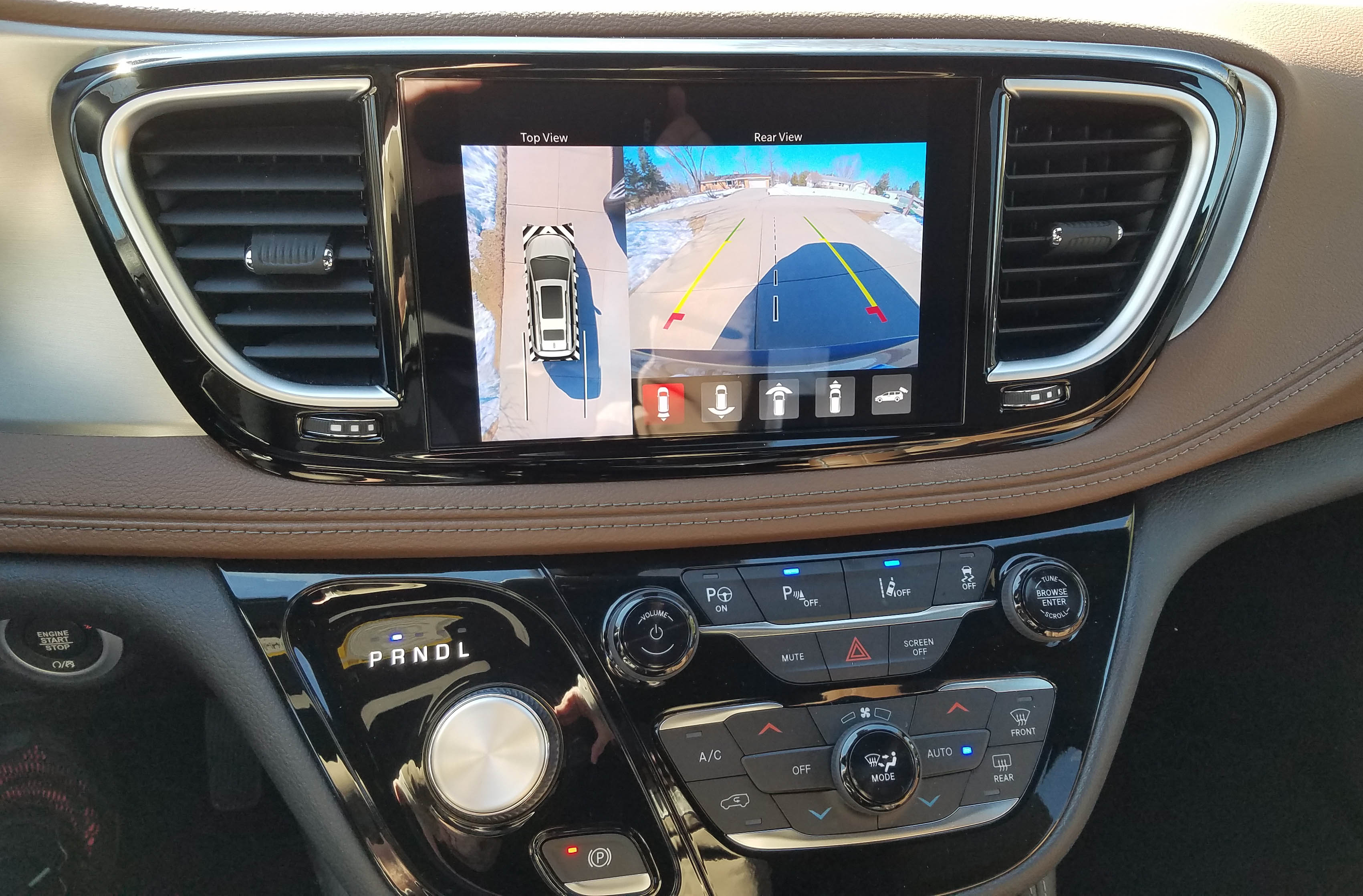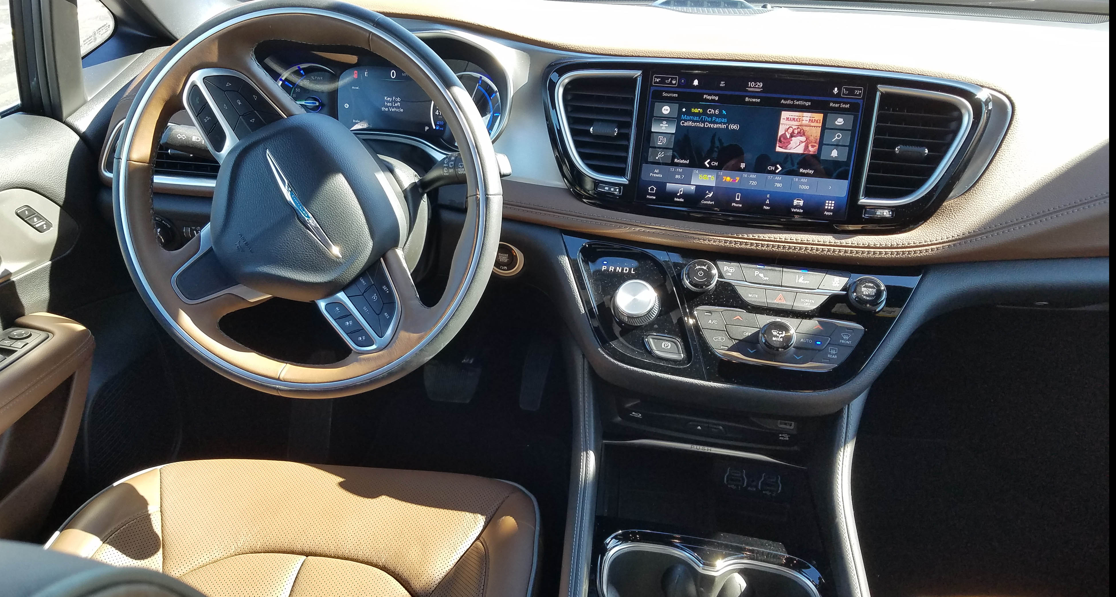 This beautiful Maximum Steel Metallic (sparkly bluish pewter) delivered a luxury look and feel interior that might surprise a first-time minivan buyer. Seats were a saddle brown with mocha brown piping and the dash and doors were brown and black, a spiffy look. Trim is all satin chrome behind gauges along with air vents and door release handles. The console and surround of the big 8.4-inch touchscreen are trimmed in gloss black. Chrysler nails the look!