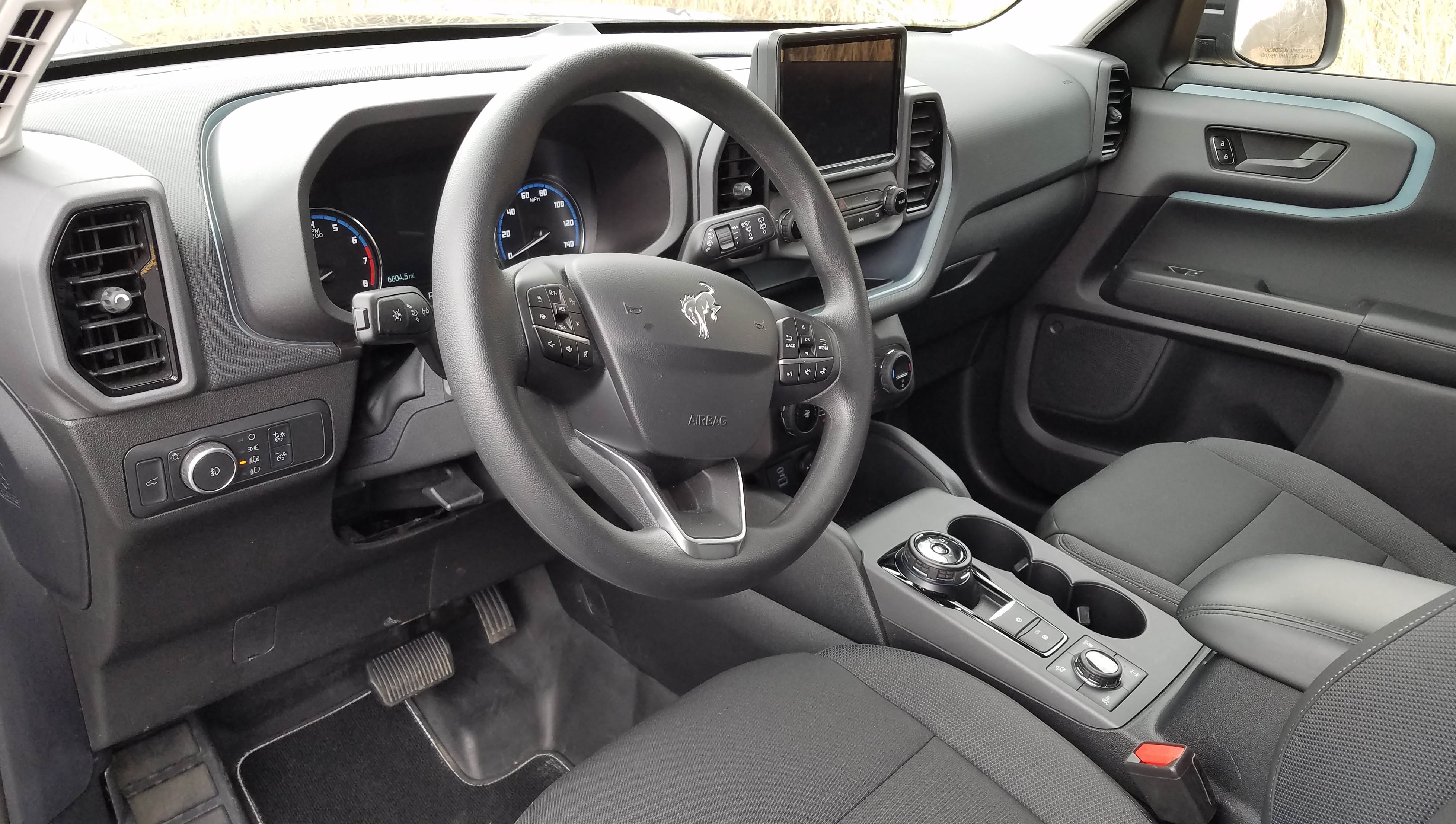 Inside, well beyond all that rubber mentioned earlier, the dash and doors are gray with blue-gray accents in the seat backs and tiny blue specks in the cloth side bolsters to perk them up a touch. The dash is a soft textured material to soften the interior’s feel and give it a fresh look. Console and steering wheel hub have matte black trim and there’s a Bronco logo on that hub too, and also on the info screen at startup. Some black gloss trims the round shift knob on the console.
