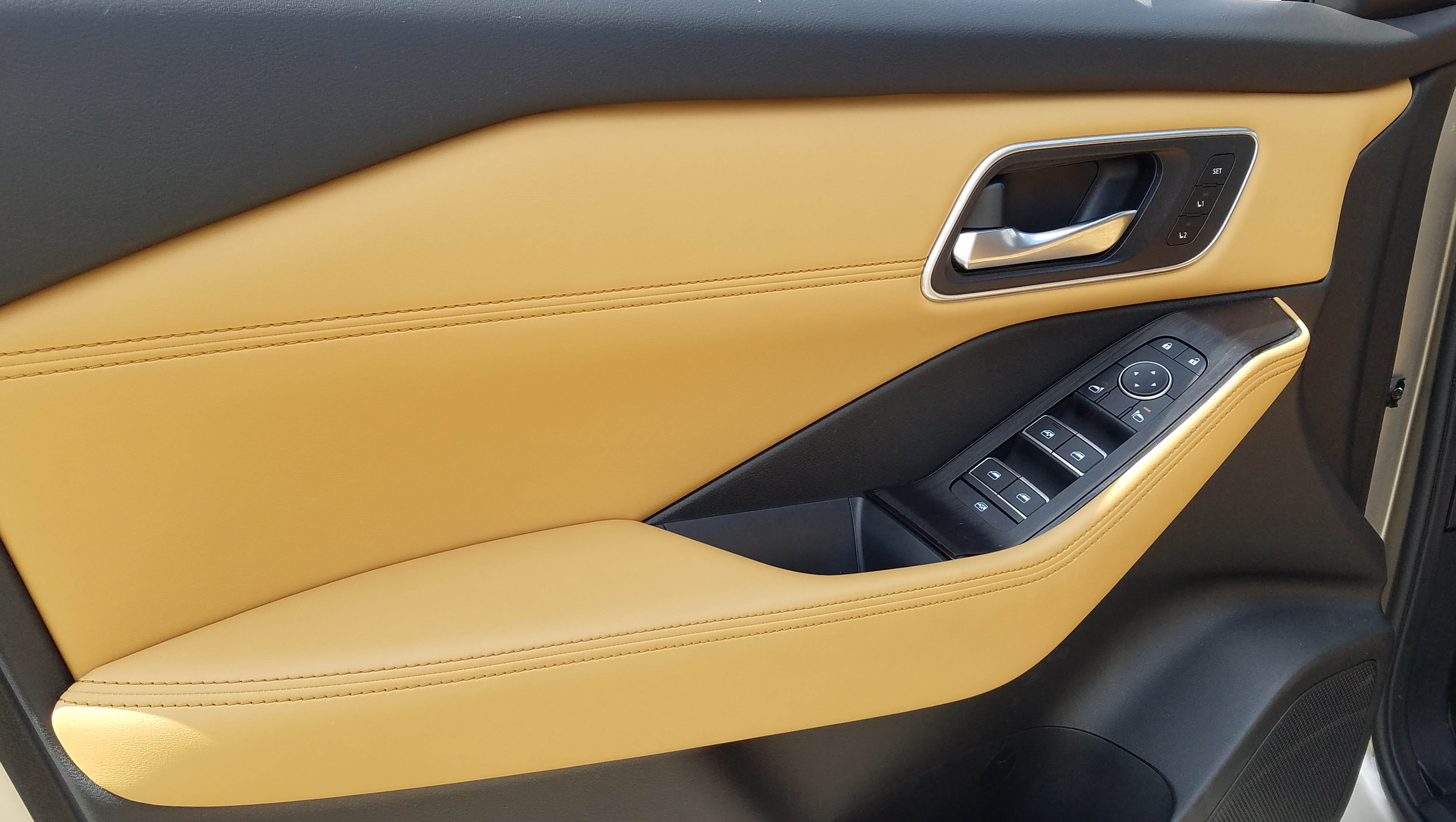 Inside, the Rogue is as handsome and comfortable as any compact SUV, the Premium model featuring thick leather seating, and dash and door trim. This one was black over a butterscotch brown with that orange-tinted brown for the quilted seats and tastefully trimmed in black. There’s a bit of fake wood facing on the passenger’s side dash, textured black trim on the console with brown sides and repeated on the door armrests. Satin chrome trims the dash and air vents and door release panels. This looks classy!