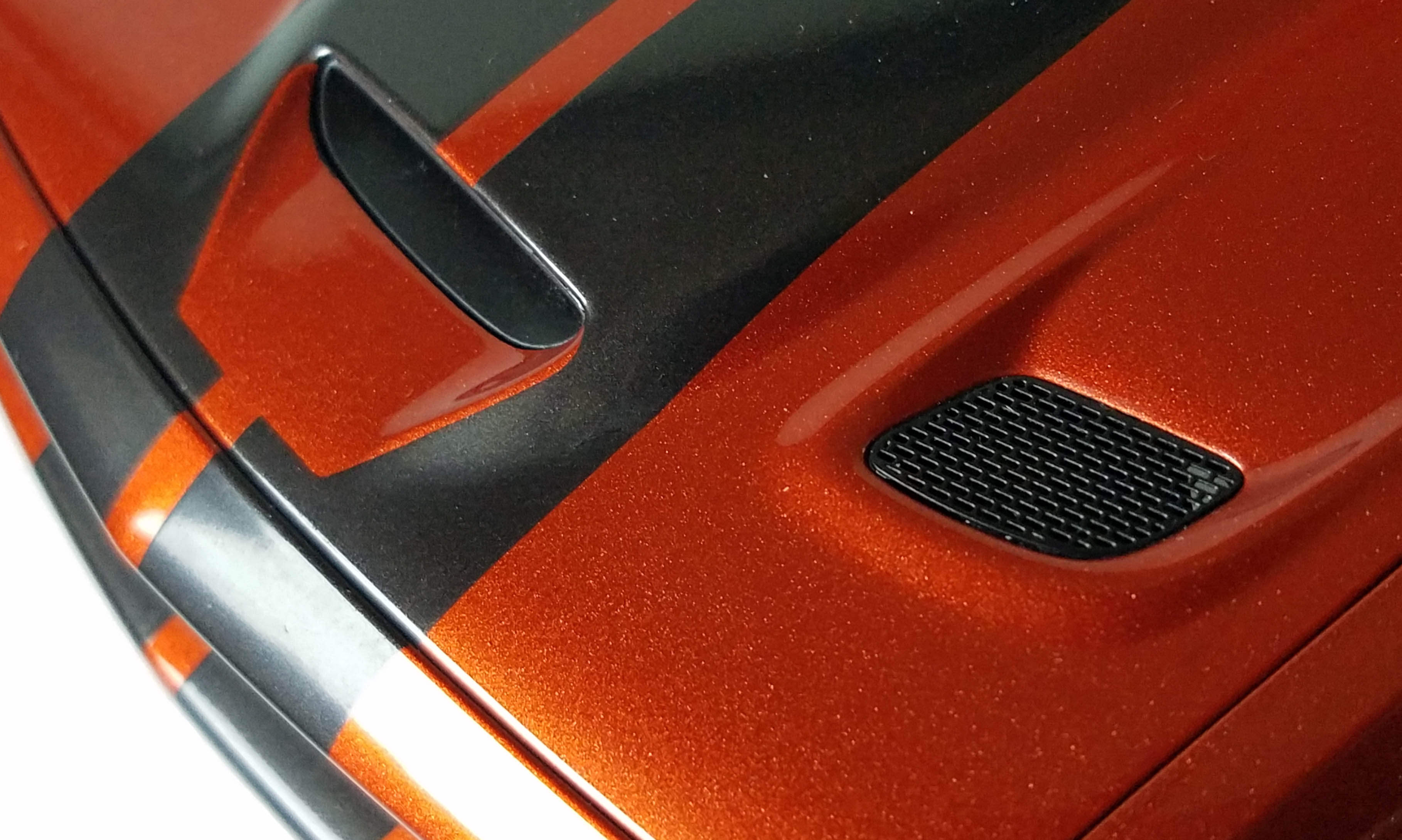 First, nose to tail the lines are crisp and dead-on 1:18 replicas of the street machines. The hood is beautifully shaped with the center air scoop featuring black mesh grillwork and the hood’s two side air vents also feature black grilles. Mesh grillwork fills all the nose’s split grille openings too and the quad headlights are beautifully reproduced, including the inner running lights with their outer light ring.