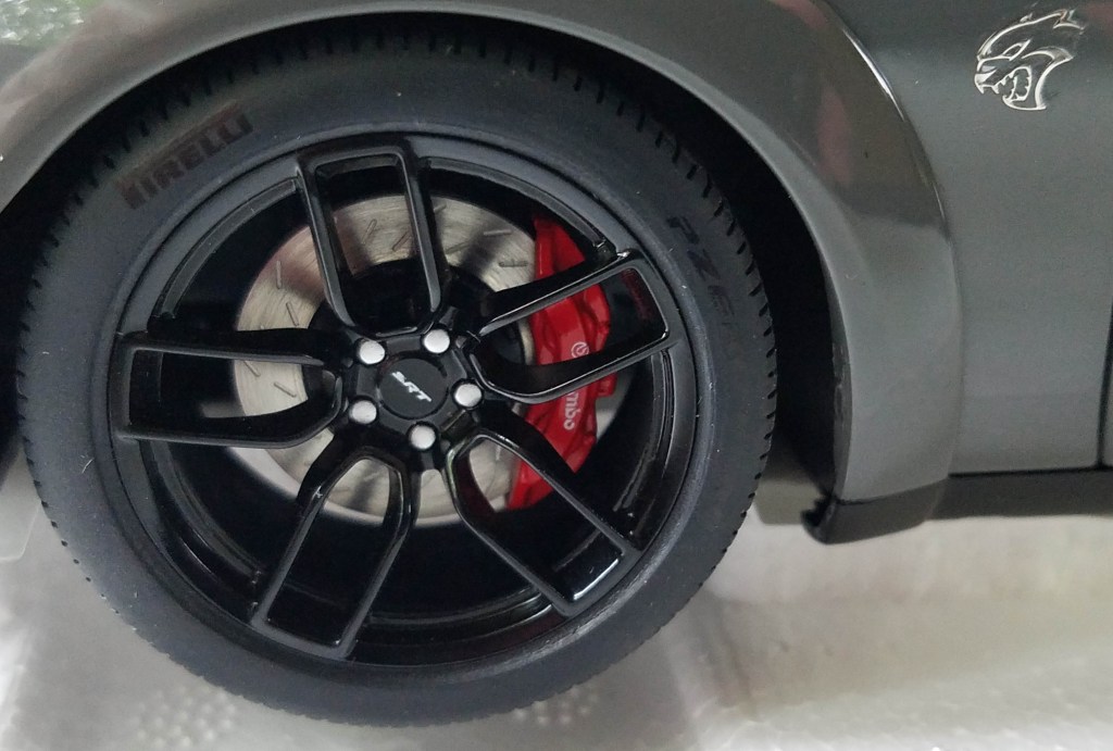 Putting that power down requires massive 20-inch tires and, naturally, superior braking power via giant discs to whoa a Hellcat. All that is detailed here on the 1:18 scale model.