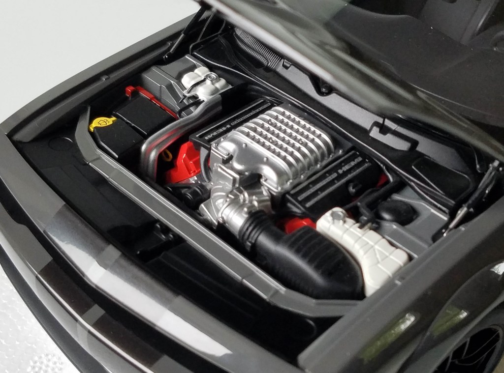 Under the opening hood, which features both scissor hinges and struts to hold it in place, is that massive V8, and yes, it says HEMI on it. A bit of wiring and plumbing is visible, but the engine and supercharger and hoses, plus cooling and liquids containers make for a tight engine bay. Detailing is strong, and impressive if you like to pose your models with the hood up.
