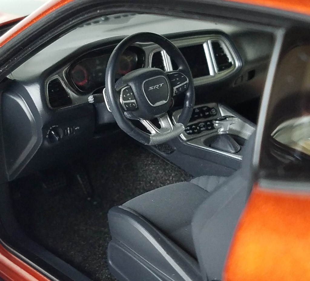 In back the wide flat slit taillights look realistic, the black surround setting off those lights and the black spoiler looks great too. The trunk will open via handsome struts and there’s black flocking finishing off the trunk’s interior. Dual chrome-tipped exhausts are flush with the black lower bumper and Dodge is spelled out with photo-etched letters on the black trunk face. A Dodge license also hangs on the back.